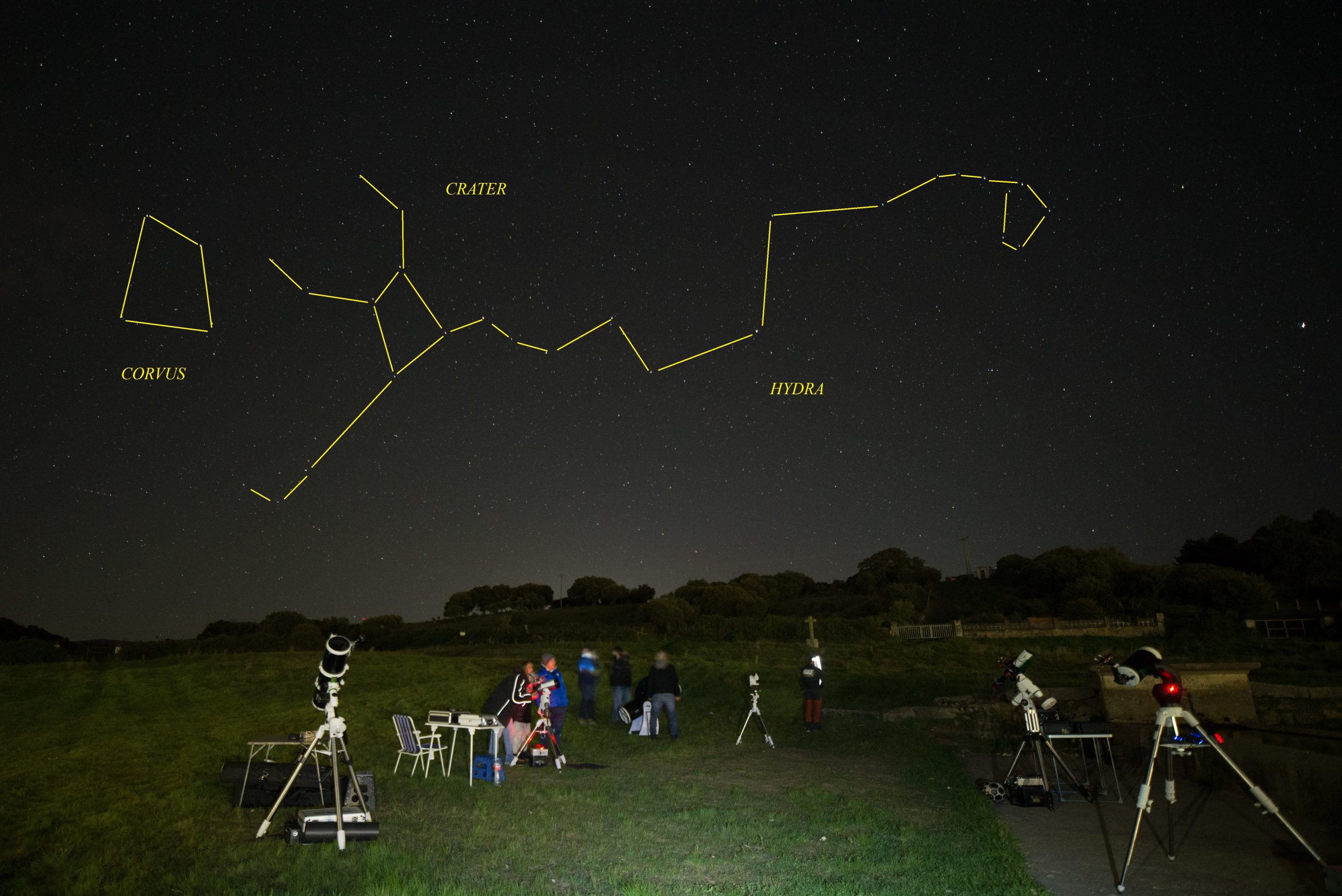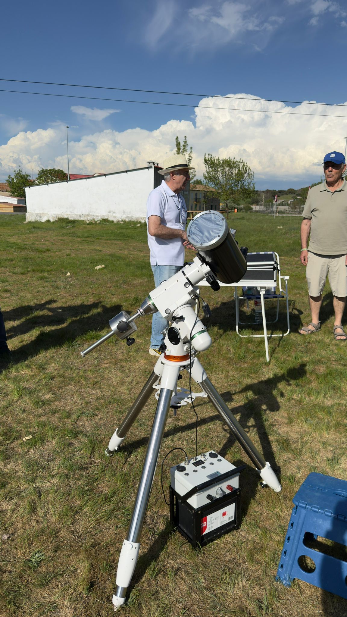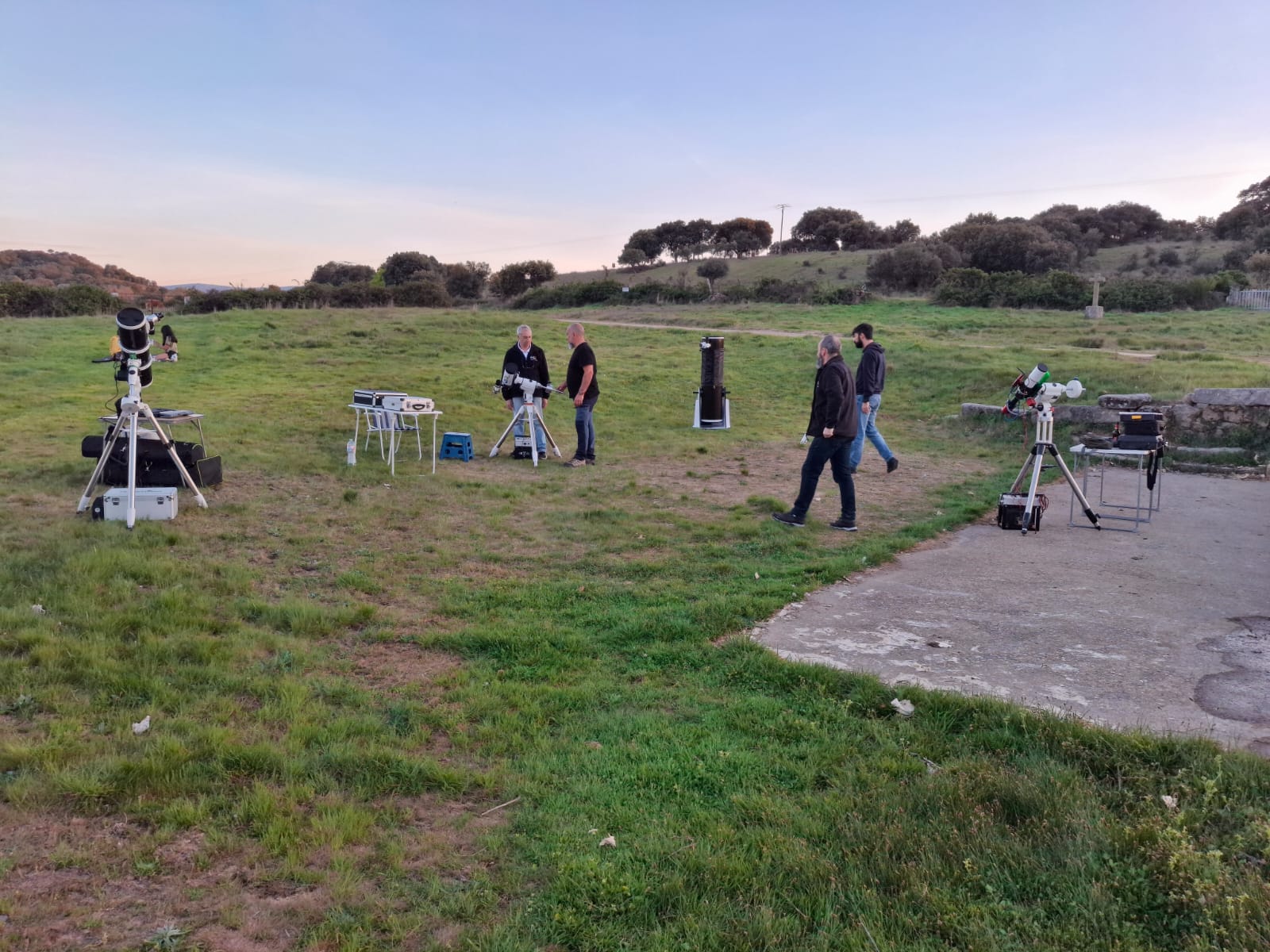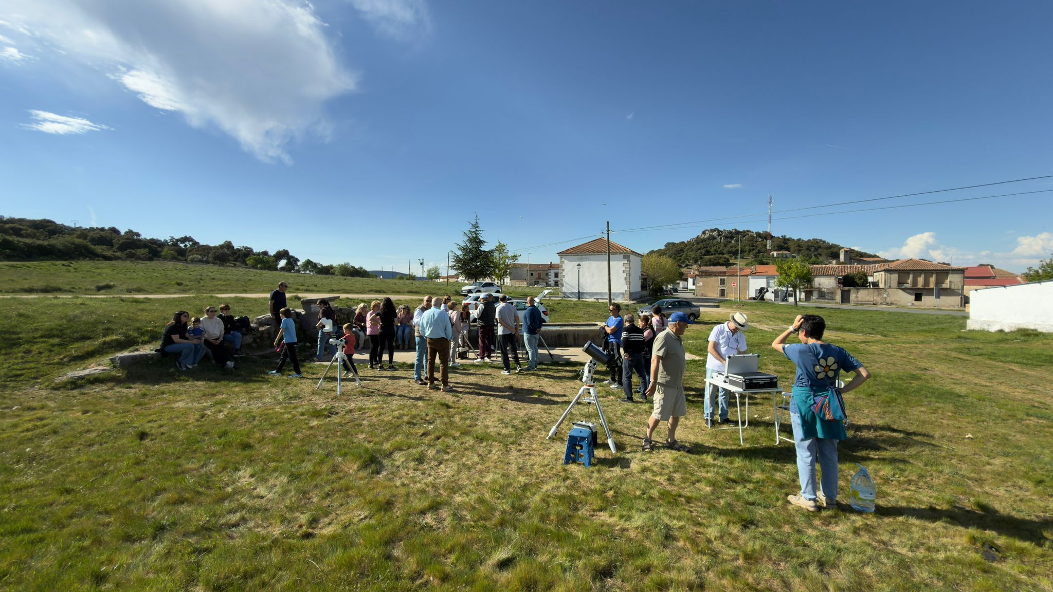 La Observación de primavera 2026 se realizó en el pueblo de La Cabeza de Béjar, unos kilómetros al sur de Guijuelo. Por la tarde Roberto e Eliseo llegaron al pueblo y montaron los telescopios solares H alfa, y luz blanca con lámina Baader detrás de la ermita situada a la entrada. Enseguida llegaron curiosos, niños y autoridades locales. También fueron acercándose mas socios de OSAE, como José Antonio y familia, Daniel, Bene y Félix. Roberto montó rápidamente el flamante y nuevo telescopio Seestar, que también se dirigió a observar el sol. Algunos socios aprovecharon para aprender a manejarlo y familiarizarse con su funcionamiento. Llegando el atardece dispusimos un proyector en las escuelas y OSAE dio una charla introductoria acerca del evento del año que va a ser el eclipse solar. Aproximadamente 30 personas permanecieron expectantes a las explicaciones e informaciones. Las autoridades del pueblo tuvieron a bien invitar a los socios OSAE a una suculenta cena. Tras dar fin al postre pasamos a la observación del cielo nocturno. Unas 50 personas nos acompañaron con mucho interés. Hicimos un recorrido a simple vista de las costelaciones y estrellas visibles. La observación a través de los telescopios también fue muy celebrada y admirada, del mas grande al mas pequeño. Estuvimos observando Júpiter, cúmulos globulares, galaxias y estrellas dobles que se ponían a tiro de telescopio en la una noche bastante oscura. A las 01:00 recogimos con una temperatura y ausencia de viento que invitaban a seguir.