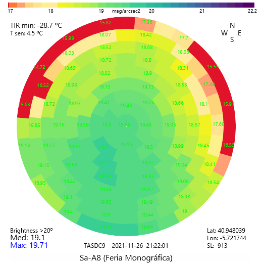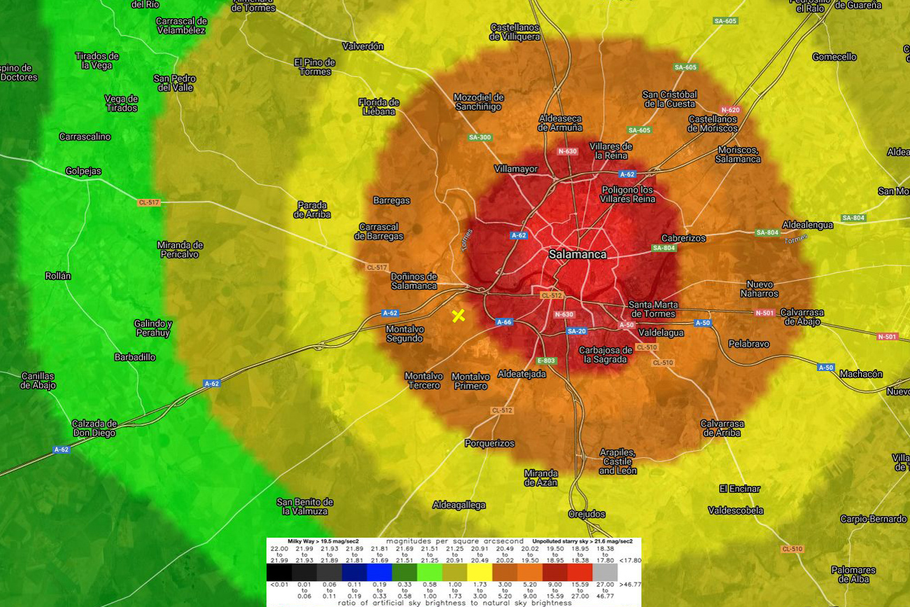 | Contaminación lumínica: | Es un lugar bastante oscuro. El valor teórico máximo de contaminación lumínica es de 19.60 por arcosegundo al cuadrado,por lo que se trata de un valor muy pobre para hacer astrofotografía. Las fuente de contaminación de lumínica más fuerte es sin dura la ciudad de Salamanca, que está situada a pocos kilómetros al Noreste. Aunque hay otros focos de contaminación lumínica, no son destacables al de Salamanca. Para observar algo de ciel oprofundo, es muy recomendable mirar hacia el cenit o alrededores. Para estrellas o cúmulos abiertos, se peude bajar algo más. Para planetaria, sin problema. |