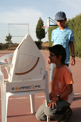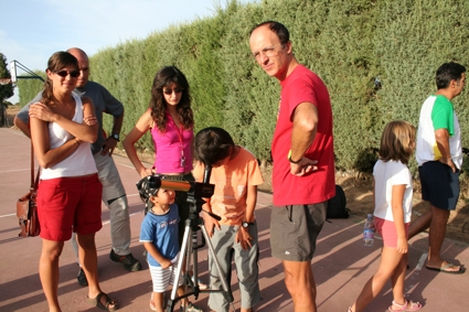 Poco después fuimos ver el Sol en un parque cercano a la sala multiusos, aunque por desgracia se juntaron varias pegas para disfrutar de unas observaciones buenas. La primera de ellas fueron las nubes, que aunque eran cirros, eran lo suficientemente densos para molestar. Eso si, tuvimos pequeños paréntesis en los que pudimos ver el Sol y esas molestas nubecillas. La otra pega y también ajena a nosotros fue que el Sol no estaba demasiado activo. No mostraba ninguna mancha solar por lo que con el Solarscope solo pudimos ver el disco solar sin ningún detalle. Con el PST tuvimos algo más de suerte, aunque no mucha más. Durante los pocos momentos que tuvimos al Sol fuera de los cirros, pudimos ver un par de pequeñas protuberancias situadas en puntos opuestos del disco solar. Una de ellas incluso había que esforzarse para diferenciarla. También se pudo observar una zona cercana al limbo solar mas clara del resto, pero debido al poco margen que nos dieron las nubes no pudimos disfrutar todos. Ya cerca de la puesta de Sol y con el mismo inmerso en las nubes medias, hicimos un pequeño descanso para comer algo.