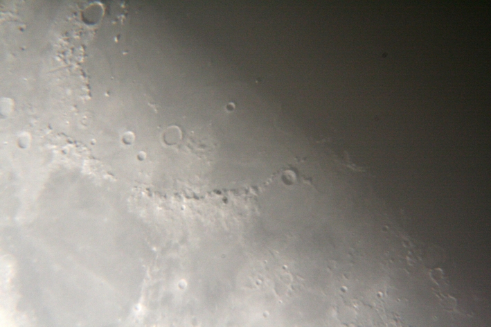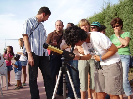 Fotos: Si. Sacamos algunas fotos de la Luna solamente, puesto que las nubes impidieron realizar fotografias a objetos mas débiles, incluso las fotos de la Luna se realizaron atraves de los cirros. En cuanto al Sol, conseguimos un par de fotos también con la presencia de las nubes, con lo que no pudimos conseguir buen material esta noche.Con lo que solamente ponemos un par de ellas de la Luna, otra del Sol y eso si, bastantes panorámicas de la gente que se acercó a los talleres y las observaciones. A ver si la próxima vez tenemos mejor suerte con el tiempo.