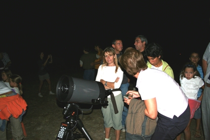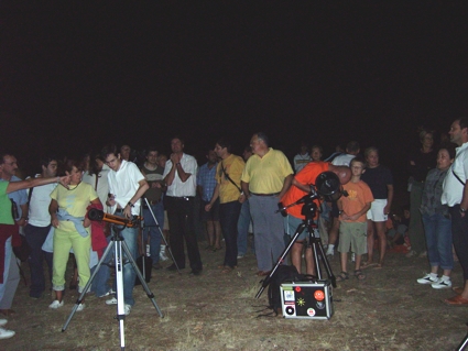 A las 21:00 montamos los telescopios en otra zona distinta, no desplazamos hasta el depósito de la Urbanización con el fin de evitar las luces y tener un cielo mejor. Según montamos los telescopios las nubes iban creciendo y apoderándose de los cielos. A duras penas pudimos ver la estrella Polar para alinear los telescopios y algunas de las estrellas necesarias para ponerlos en posición. Al poco de conseguirlo las estrellas desaparecieron entre las nubes. Lo primero que hicimos fué ver la Luna y Júpier con casi todos los telescopios. La gente miraba por todos ellos mientras atendían a las explicaciones de los socios. En Júpiter pudimos ver entre las nubes el disco del planeta con pocos detalles y 3 de sus principales satélites, ya que uno de ellos se encontraba en eclipse. También hubo público que se acercó con sus prismáticos y telescopios y estuvimos asesorándoles en la medida de lo posible. Lo más destacado fue la Luna al observarla con los telescopios, ya que se encontraba en una fase propicia para disfrutar de algunas zonas interesantes y muy conocidas por los observadores lunares. Incluso con las nubes haciendo presencia pudimos observarla relativamente bien durante las primeras horas hasta que se tapó definitivamente por nubes bastante mas espesas. Algo que gustó mucho a le gante eran las explicaciones de anécdotas y curiosidades que iban aclarando algunos de los socios. Manuel Gutiérrez un gran conocedor del cielo a simple vista deleitó a los presentes (servidor incluido) con muchas curiosidades del cielo. En cuestión de prismáticos y también a simple vista Tato, y Juan Carlos también nos enseñaron bastante y aprendimos cosas interesantes. En los aspectos mas técnicos Juan Carlos duran también demostró sus dotes de enseñanza. En fin, aunque hubo nubes, la gente disfrutó bastante porque entre nube y nube atendían a las explicaciones de los socios. También tuvimos algunos claros cerca del cenit que no permitieron ver algunas estrellas interesantes y reconocer algunas constelaciones aunque fuera por poco tiempo. En cuanto al frío, a pesar de que soplaba viento, no hizo casi nada de frío, en ese aspecto fue una noche agradable.
