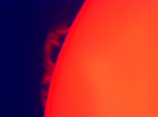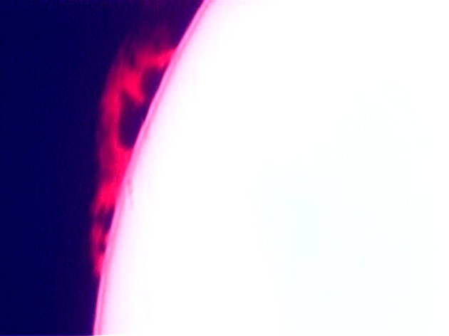 Arriba: Protuberancia capturada por la tarde, con la webcam y procesada con registax v3 y retocada con corel photoshop. excepto la primera que fué obtenida por la mañana con una cámara de video, directamente al ocular. En las fotografías se muestran diferentes tomas de la misma protuberancia, a 2ª muestra la imágen original y la 3ª es la misma, pero con el Sol pintado de negro para resaltar mejor la protuberancia. La 4ª está tomada al final de las observaciones, y se puede apreciar el ligero cambio de la forma con respecto a las prieras tomas. La 5ª es la misma pero sin pintar el disco solar.