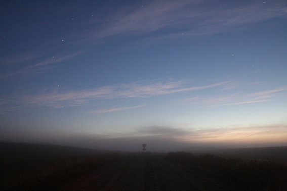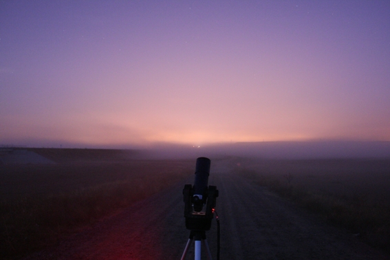 El relato: Al llegar al lugar, la noche prometía, el cielo estaba prácticamente despejado excepto el horizonte por donde se estaba ocultando la Luna. A las 6:00 comencé a alinear los telescopios, primero el meade, pero con la falta de práctica al final lo deje en manual. Decidí no alinear el Celestron aun porque hacía bastante frió y era muy probable que se empañara. mientras fui observando M42 y M 45 con el ETX 70, y me sorprendió lo bien que se veía, y a demás, en comparación con el Celestron tiene mucho mas campo. Intenté realizar alguna fotografía por proyección de ocular, pero sin buenos resultados, al no disponer de seguimiento. Al poco rato, vi que iba cogiendo altura la zona donde tenía que estar el cometa y fui alineando el telescopio mio. Lo primero que apunté para comprobar la alineación fue El cúmulo doble de Perseo, y lo dejó fatal, después probé con Saturno, y aunque lo dejó mal, al menos lo dejó dentro del campo del buscador. Visto que no podía utilizar el GOTO para localizar el cometa, decidí buscarlo a "ojo" con el buscador, y a demás rápidamente, puesto que estaba empezando a levantarse niebla de una forma muy rápida. Lo localicé en pocos minutos he hice algunas tomas con la Canon EOS 350D. No le podía dar mucha exposición por el fallo de seguimiento de la montura. Las fotos que realicé fueron de 30 y 60 segundos de exposición y aun así salían movidas. La mayor parte de ellas las hice cuando el cometa a penas se distinguía por el buscador y luego incluso ni por el buscador, hasta que llegó un momento que lo perdí por la cantidad de niebla, a demás se estaba empezando a empañar el Celestron. La niebla durante algunas de las fotos era tan espesa, que ocultaba (literalmente) todas las luces de la ciudad de Salamanca, no se distinguía nada a 20 metros de distancia. Entre foto y foto estuve mirando el cometa con el ETX 70, y aunque no se distinguía la cola, se notaba perfectamente la coma del cometa. Aguanté un poco mas tapando el tubo, pero cuando la niebla se retiró (por algunos minutos) ya había avanzado el crepúsculo lo suficiente para impedir la observación del cometa.