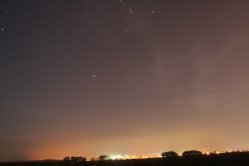 Notese la comtaminación lumínica que produce este pequeño pueblo de Salamanca, Por su puesto, La contaminación de Salamanca es muchísimo Mayor, aunque no la fode fotografiar a causa de la niebla, que tapaba por completo todas las luces de la ciudad.