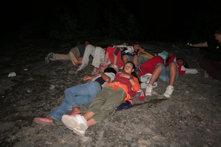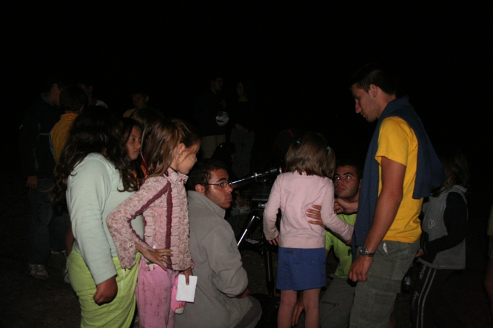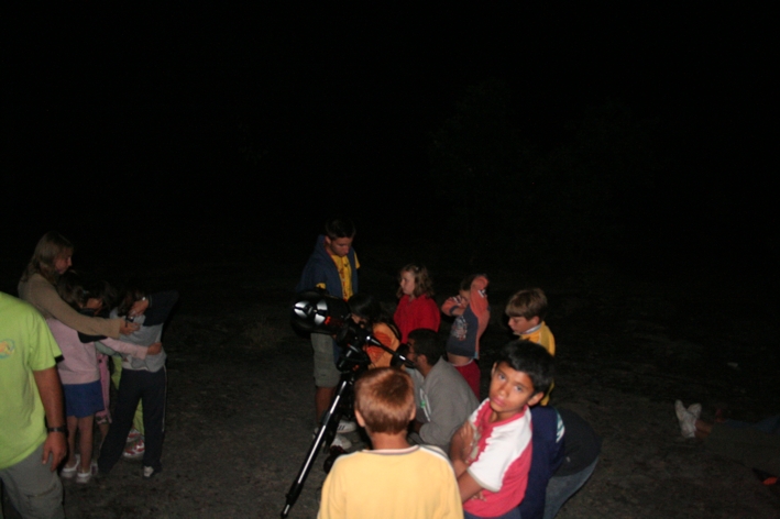 El relato: Sobre las 22:20 dos monitores me ayudaron a preparar el telescopio y demás accesorios y poco después de alinearlo, llegaron todos los niños. Al principio se explicaron brevemente algunos conceptos básicos de astronomía, como por ejemplo que son las estrellas, los planetas y como diferenciarlas. También se enseño la localización de la Osa Mayor y la estrella Polar. A las 23:49 pudimos observar todos durante algunos segundos el paso del satélite de telecomunicaciones Iridium 46 que brilló con una magnitud de -1. A continuación se procedió a explicar que son las estrellas fugaces, puesto que esta noche veríamos alguna que otra. Y... de hecho tanto chicos como monitores observaron varias, algunas de ellas muy brillantes y con estela.