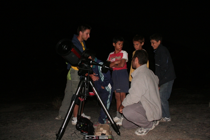 Las fotos de arriba muestran distintos momentos de la noche con los chicos viendo las estrellas y por el telescopio ayudados por los monitores.