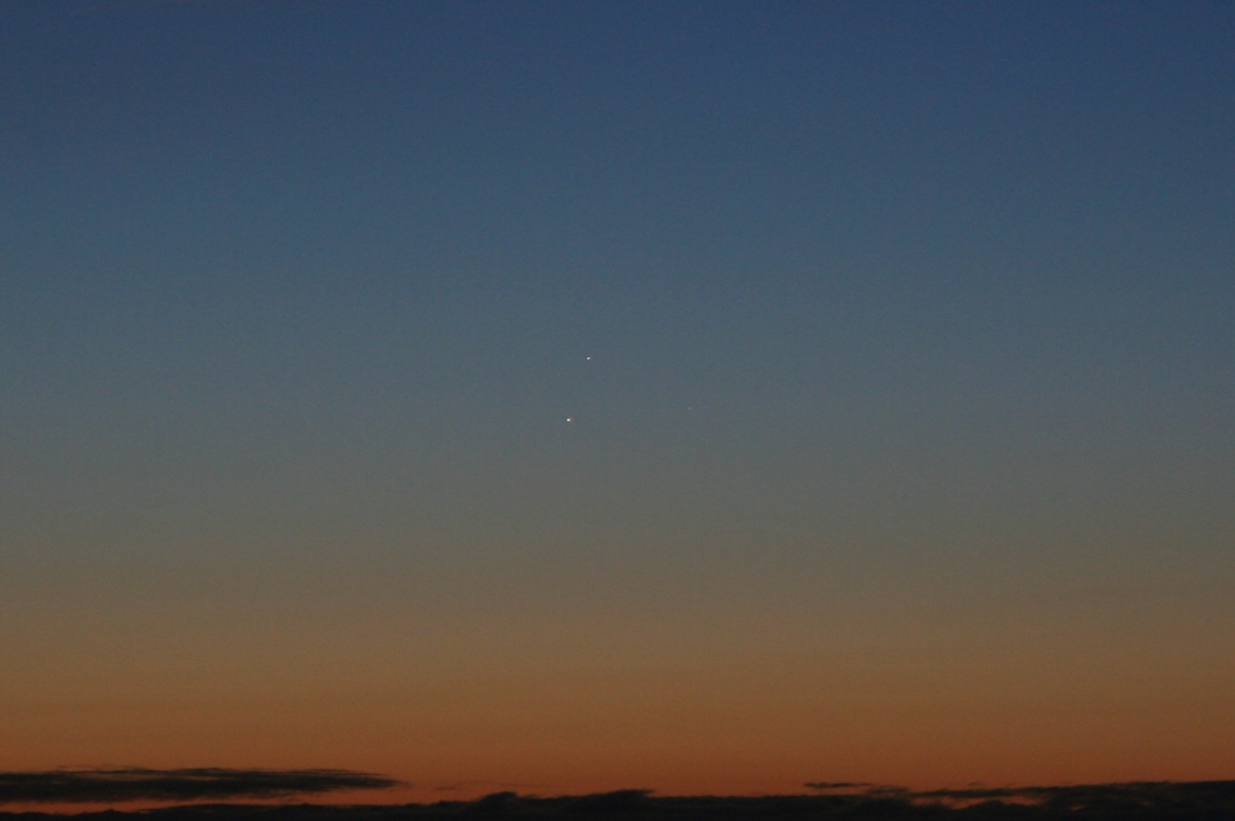 LLegué sobre las 7:30 a la meseta y ya vi a Mercurio y Júpiter muy cerca del horizonte, no tarde nada en montar el trípode y colocar la cámara para empezar a disparar. La mayoría de las tomas las realicé con un ISO bajo, del orden de 100 ó 400, para que no tuvieran mucho grano las imágenes. También tuve tiempo para ver la conjunción por telescopio, con mas y menos aumentos, aunque no me detuve mucho tiempo en ello. Eché un pequeño vistazo a La Luna que estaba espléndida y como no a su compañero de esta noche Saturno.