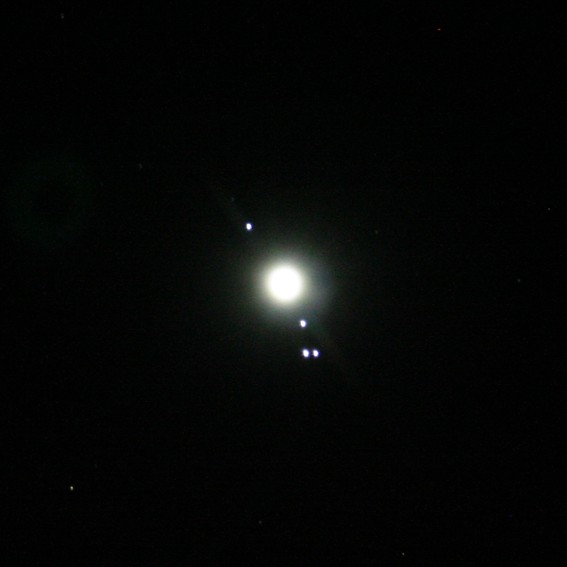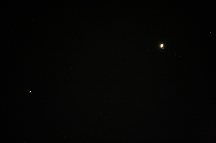 El relato: LLegamos cuando aun quedaba luz del crepúsculo y aprovechamos para ir montando los telescopios. Una vez montados y alineados, lo primero fue fotografiar la conjunción de saturno y Marte, que se encontraban a tan solo 37' de arco. Los fotografiamos con la cámara a foco directo acoplada al celestron. También echamos una miradita por el ocular, claro!!!. Después seguimos con Júpiter y así aprovechamos para enfocar un poco mejor la cámara, sacamos alguna foto del planeta con sus satélites con el mismo método y también nos recreamos viendo el planeta por los oculares y utilizando filtros para resaltar mejor los detalles de la atmósfera, lo cual conseguimos poniendo un filtro amarillo y uno de densidad neutra, aunque probamos con el rojo y con el verde también. La gran mancha roja se veía estupendamente con el ocular de 6mm (recordar que tenemos el reductor de focal puesto en todo momento) y se resaltaban muy bien las bandas nubosas.