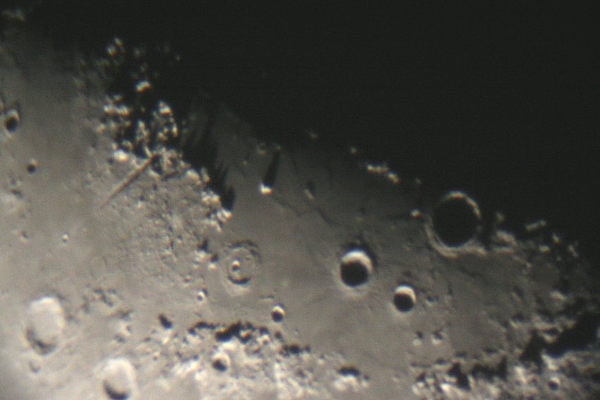 | Dos fotografías de detalles lunares donde se aprecian varias formaciones interesantes, los montes Alpes con su sombra proyectada e nla superficie, el crater Cassini, La falla de los Alpes, etc... | |
