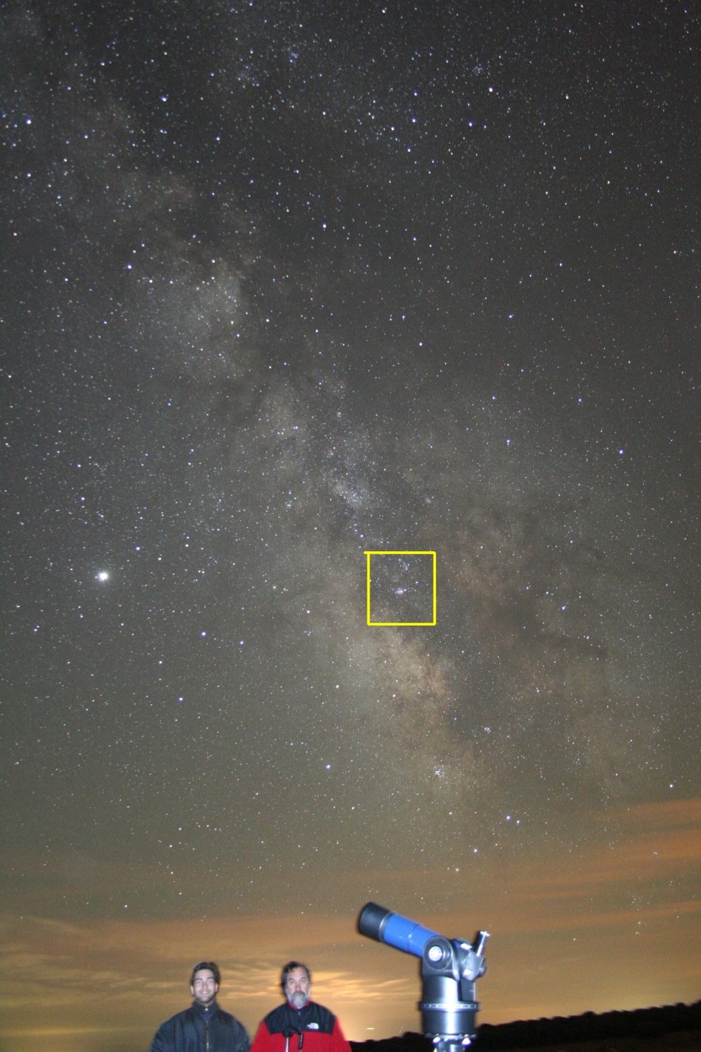 También nos sacamos una para el recuerdo con la vía Láctea de fondo y sobre las 2:30 recogimos. Noté como el seguieminto era peor hacia el Sur, cosa que mejoraba en el Norte, en el sur con 30 segundos de exposición en las fotos se notaban los trazos estelares, mientras que apuntando cerca del norte (M51) pude darle sin problemas 60 segundos de exposición a las fotos. También fotografiamos alguna constelación menor, pero por problemas de espacio yque no salieron demasiado bien, no vamos a poner las fotos.