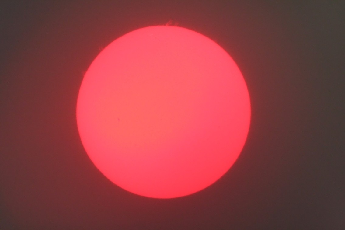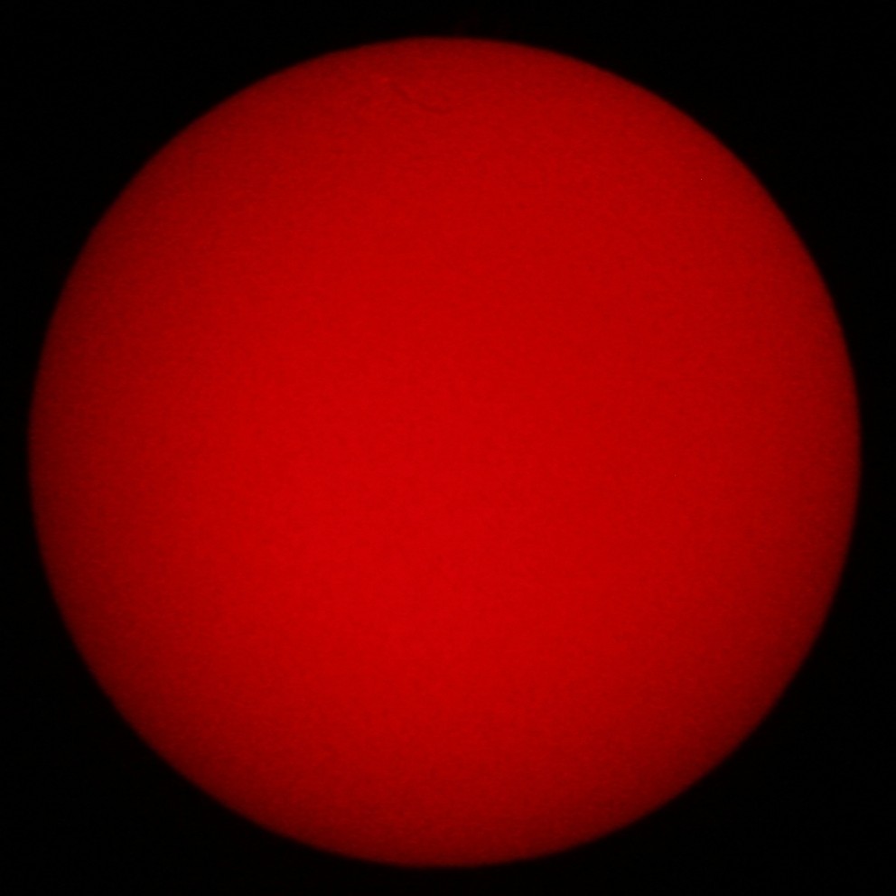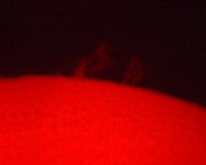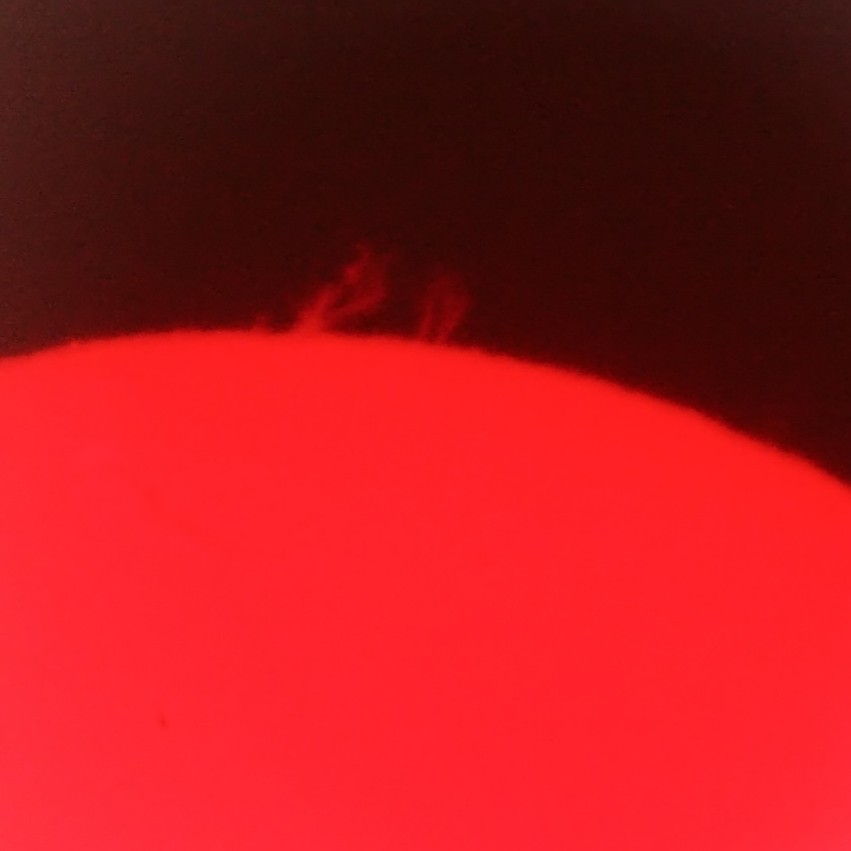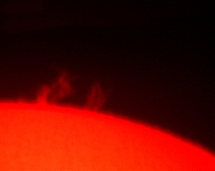 El relato: Hoy estaba interesante el Sol, aunque no tenía ninguna mancha solar, se mostraba bastante activo en la banda del H-Alpha. Se podían ver varias protuberancias destacando 2 de ellas. Aunque en las fotos no se aprecia, las dos protuberancias mayores terminaban en filamentos muy delgados y daba una imagen espectacular. También se podía ver una fácula mas o menos grande cerca de las protuberancias, estuve admirando un ratito nuestra estrella y saqué algunas fotos con la Canon. Hoy me ha costado menos enfocar. Después de todo incluso saqué un vídeo con la cámara de vídeo Sony.