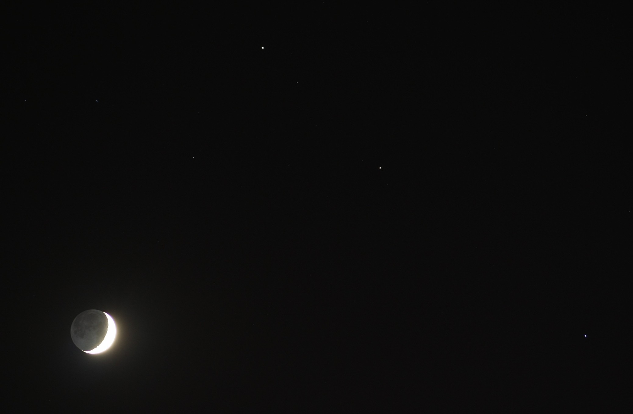El relato: Esta ha sido la primera vez que he montado el equipo nuevo para ver que tal funciona. El telescopio es un Sky-Watcher refractor de 102mm de diámetro y 500mm de focal y la montura una multifunción de Sky-Watcher. La verdad es que no me esforcé nada en la alineación, de echo creo que la hice mal y todo, jaja pero es que tenía que irme a trabajar y tenía poco tiempo. Como decía. Puse la montura mas o menos alineada y primero miré La Luna aun con la luz del día con un ocular de 6mm. Daba unos detalles increíbles, muy buena definición, me recordó mucho a la imagen que veo con mi C8 con un ocular de 12mm. Después de unos minutos contemplando el creciente lunar, dirigí la mirada a Saturno, que se veía pequeñito, aunque se distinguían perfectamente los anillos y Titán. Como ya se podía ver a simple vista también Marte y regulus, acoplé la Canon EOS 350D a foco primario y realicé alguna foto de la Luna. No me costó mucho enfocar, saqué unas cuantas y después puse la cámara en Piggy-Back con el objetivo 70-300 y saqué otras cuantas de la conjunción. No tuve demasiado tiempo, recogí pronto para irme a trabajar, pero quitando la enorme contaminación lumínica de Madrid, era una imagen bonita. Por cierto... el seguimiento era mas bien malo, en exposiciones demás de 4 segundos había desplazamiento de estrellas. Seguramente sea por la mala alineación, a ver si otro día con mas calma lo intento otra vez.