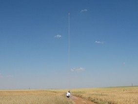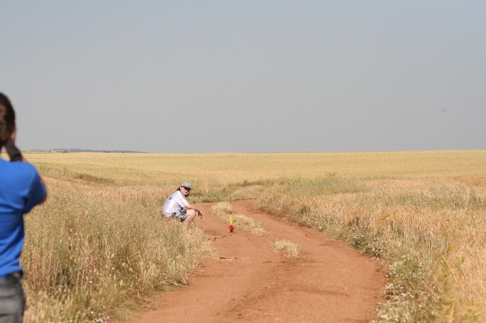 El relato: Llegamos todos al lugar de lanzamiento de la última vez sobre las 18:00, dejamos los coches apartados del punto de lanzamiento y nos pusimos manos a la obra. La idea de hoy era la de lanzar dos cohetes, uno primero de exhibición y para comprobar si el viento no afectaba demasiado a la trayectoria y podíamos lanzar el siguiente sin problemas. y el Segundo era la Misión VABA II, que llevaría abordo una cámara de video para grabar el lanzamioento desde el cohete. Al final, solamente lanzamos el primero de ellos por los motivos que se detallan acontinuación.Vimos que el sembrado estaba muy alto, con lo que sería complicado encontrar el cohete si se iba muy lejos, aun así decidimos lanzarlo. Primero colocamos la varilla guía para el cohete, y luego procedimos a meter el motor en el cohete y preparar todo para la ignición. Había algo de viento antes del lanzamiento, auqnue paró casi totalmente justo cuando nos decidíamos a lanzarlo. Se hizo la cuenta atrás y se lanzó el cohete. Como un minuto y medio después aterrizó aunque no lo pudimos encontrar, por hacerlo muy lejos de nuestra posición y caer en una zona alta de sembrado. A si que decidimos aplazar el siguiente lanzamiento para otro día y otro lugar, donde las condiciones de recuperación sean mas fáciles. En la próxima misión repartiremos un equipo de recuperación del cohete. Nos pusimos a buscar el cohete guiandonos por las imágenes que grabamos en vídeo, pero despues de 1 hora y media de búsqueda, nos dimos por vencidos y nos retiramos sin haberlo encontrado.