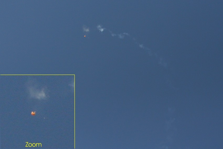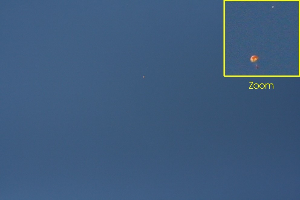 | Lanzamiento | Apertura del paracaídas en el púnto máximo | Cohete descenciendo con el paracaídas (se ve también el algodón ignífugo que iba dentro del cohete) | ||