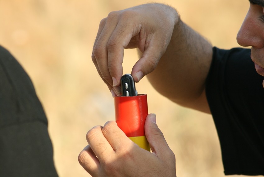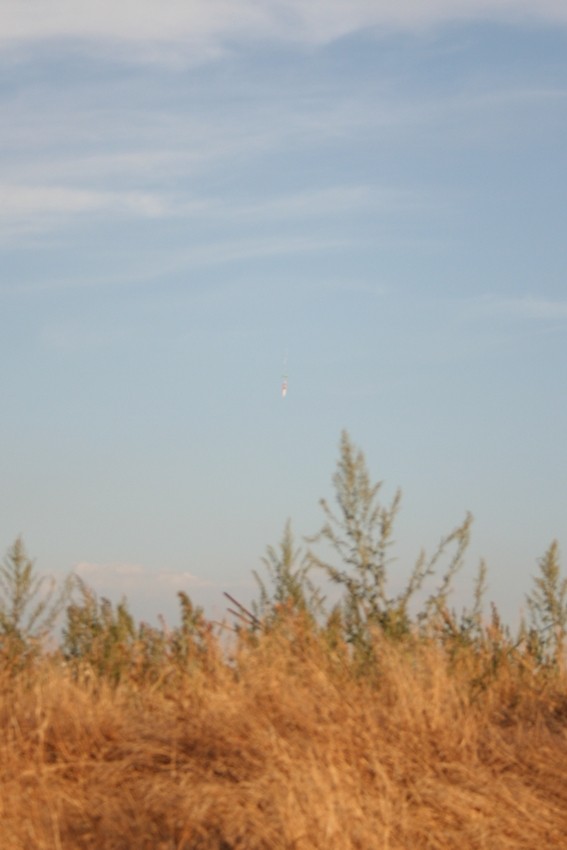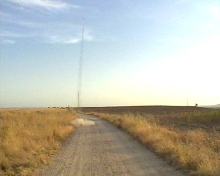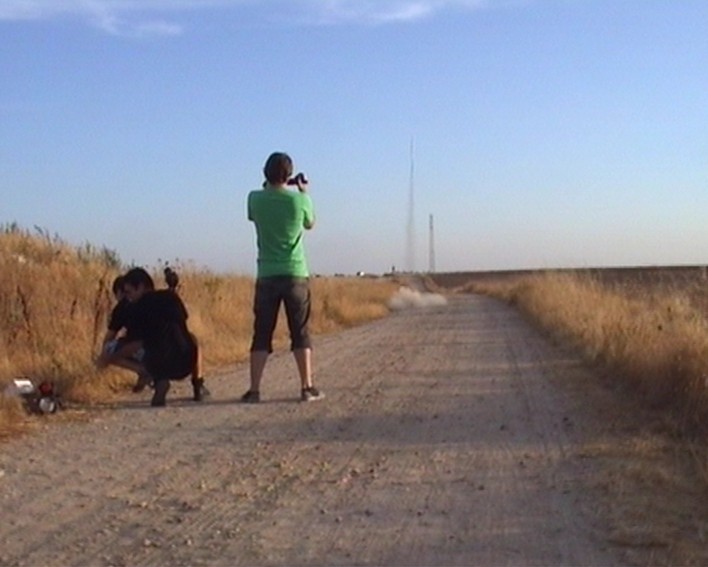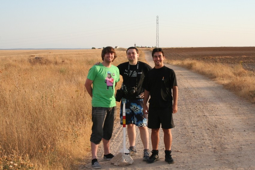 El relato: Llegamos al lugar seleccionado para el lanzamiento sobre las 19:45. Hemos elegido este sitio, puesto que no está cerca de ningún obstáculo que pueda poner en peligro algo, Este sitio lo visitamos con anterioridad en e lintento de otro lanzamiento, el cual suspendimos por olvidarnos del algodón ignífugo. Al poco de llegar, colocamos la varilla guía en e lsuelo, reforzada con una piedra de gran tamaño, y que a su vez hacía de base para el cohete. Mientras, terminábamos de montar el cohete, lo que es la sujeción del paracaídas a la sección de carga útil, etc.. Insertamos la cámara de vídeo dentro del compartimento de carga útil y la pusimos a grabar. Al ir a colocar en la rampa de lanzamiento, nos dimos cuenta que iba muy forzado, seguramente porque con el tiempo se haya dado de si el tubo de papel que utiliza como guía el compartimento de carga útil, al final decidimos suprimirlo, ya que había estabilidad y no suponía un riesgo.Colocamos el cohete en la rampa de lanzamiento y conectamos los cables para su encendido y nos dispusimos para realizar la cuenta atrás. la primera de ellas fue fallida, puesto que David no se acordaba si tenía que estar introducida la llave en el controlador o quitada, (tenía que estar puesta). A la segunda fue la vencida. Se realizó la cuenta atrás, pero el cohete tardó casi 3 segundos en despegar, al pensar que algo habíamos hecho mas, apartamos la mirada brevemente del cohete y este salió rápidamente sorprendiendonos. Se elevó muy alto y casi en vertical, hasta que lo perdimos de vista. a los 6 segundos del lanzamiento (8 desde que pulsamos el motor) se oyó una pequeña explosión indicando que la carga de eyeción del paracaídas había funcionado. Estábamos mirando todos al cielo a ver si localizábamos el cohete. A los pocos segundos Carlos A. vio el cohete cayendo y un segundo mas tarde el resto. Bueno... realmente solo era la mitad del cohete. la parte de la carga útil y el pico, junto con el paracaídas, lo malo es que el paracaídas no se había desplegado correctamente, así que lo vimos caer sabiendo que se iba a dar un "piñazo". a los 35 segundos tocó suelo y comenzamos su búsqueda, no cayó demasiado lejos, a unos 55 metros del punto de lanzamiento, tardamos en encontrarlo 5 minutos, sin demasiados problemas, a pesar que cayó en el único sitio que había donde la vegetación era alta. Lo primero que hicimos fue ver el estado de la cámara de vídeo, procedimos a la extracción de la cámara y comprobamos que estaba rota, por el golpe, el cohete estaba literalmente clavado en el suelo y el pico presentaba los síntomas claros de una caída desde casi un kilómetro de altura. Seguimos buscando durante algunos minutos mas la otra parte del cohete, pero viendo el estado de esta, no insistimos mucho en encontrar el resto. En cuanto vimos como quedó la parte que recuperamos, entendimos cual fue el fallo. La goma que sujeta ambas partes del cohete se había despejado de la parte inferior, y se había enredado con el paracaídas, por lo cual este no pudo abrirse. el pegamento parece ser que no aguantó. Lo raro es que en el lanzamiento anterior de este mismo cohete aguantó perfectamente, asique seguramente lo que haya sucedido es que ha pasado demasiado tiempo desde que lo pegamos y habrá perdido fuerza, entre eso y el calor producción por la carga de de deyección, se habrá terminado de despegar. En los próximos lanzamientos tendremos que tener en cuenta esos pequeños detalles y revisarlos in situ antes del lanzamiento. Después de aclarar lo sucedido a los presentes, recogimos y nos fuimos a casa, con la esperanza de que al menos se hubiera registrado algo con la cámara que estaba dentro del cohete, pero para nuestra desgracia, no fue así, los datos se destruyeron el el golpe de la caída.