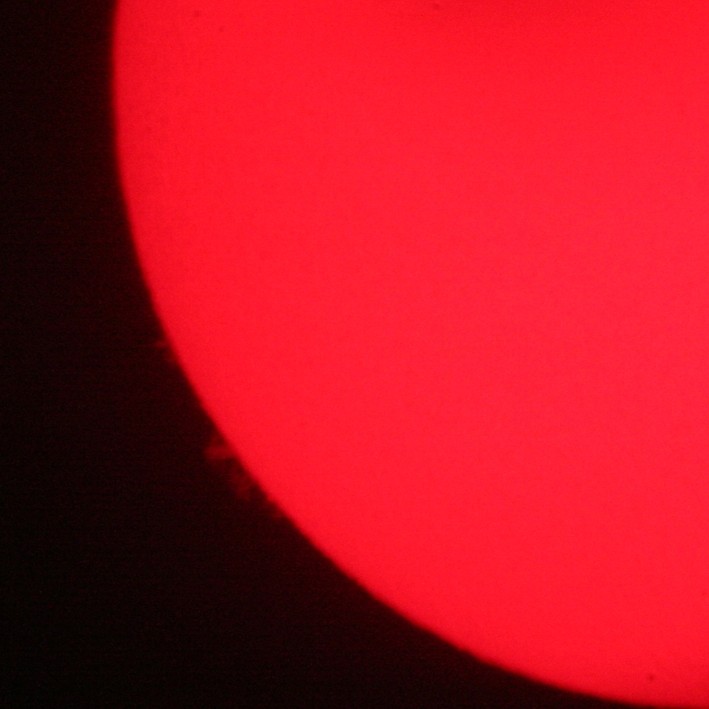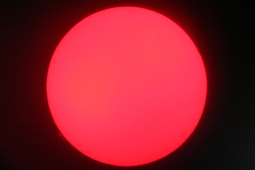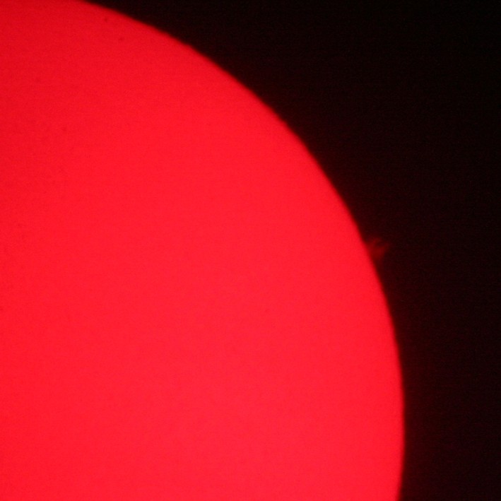 El relato: Monté el PST en el balcón para ver si tenía alguna protuberancia interesante. Para sorpresa mía y después de mucho tiempo, tenía alguna curiosilla. en la parte superior derecha un penacho que surgía de la superficie, y en la parte inferior izquierda, varias protuberancias. También tenía repartidas por otras zonas del limbo alguna mucho mas pequeña e incluso despejadas de la superficie que se llegaban a intuir si se miraba con detenimiento. Saqué unas cuantas fotografías con el método de proyección de ocular, con oculares de 6mm y de 12mm, también grabé alguna imagen en vídeo para obtener las fotos posteriores, aunque no me quedaron muy bien. Al principio, como es habitual me costó enfocar para sacar bien las fotos, pero una vez logrado, no supuso demasiado problema el enfoque. Varía un poco el enfoque visual al de las cámaras , una vez enfocadas las cámaras, lo veía algo borroso visualmente, y tuve que girar el mando del enfoque un poco hacia la izquierda para verlo correctamente, menos de un cuarto de vuelta. Para que sirva como referencia a la hora de sacar fotos otro día. La superficie no mostraba fáculas ni manchas solares, estaba limpia.