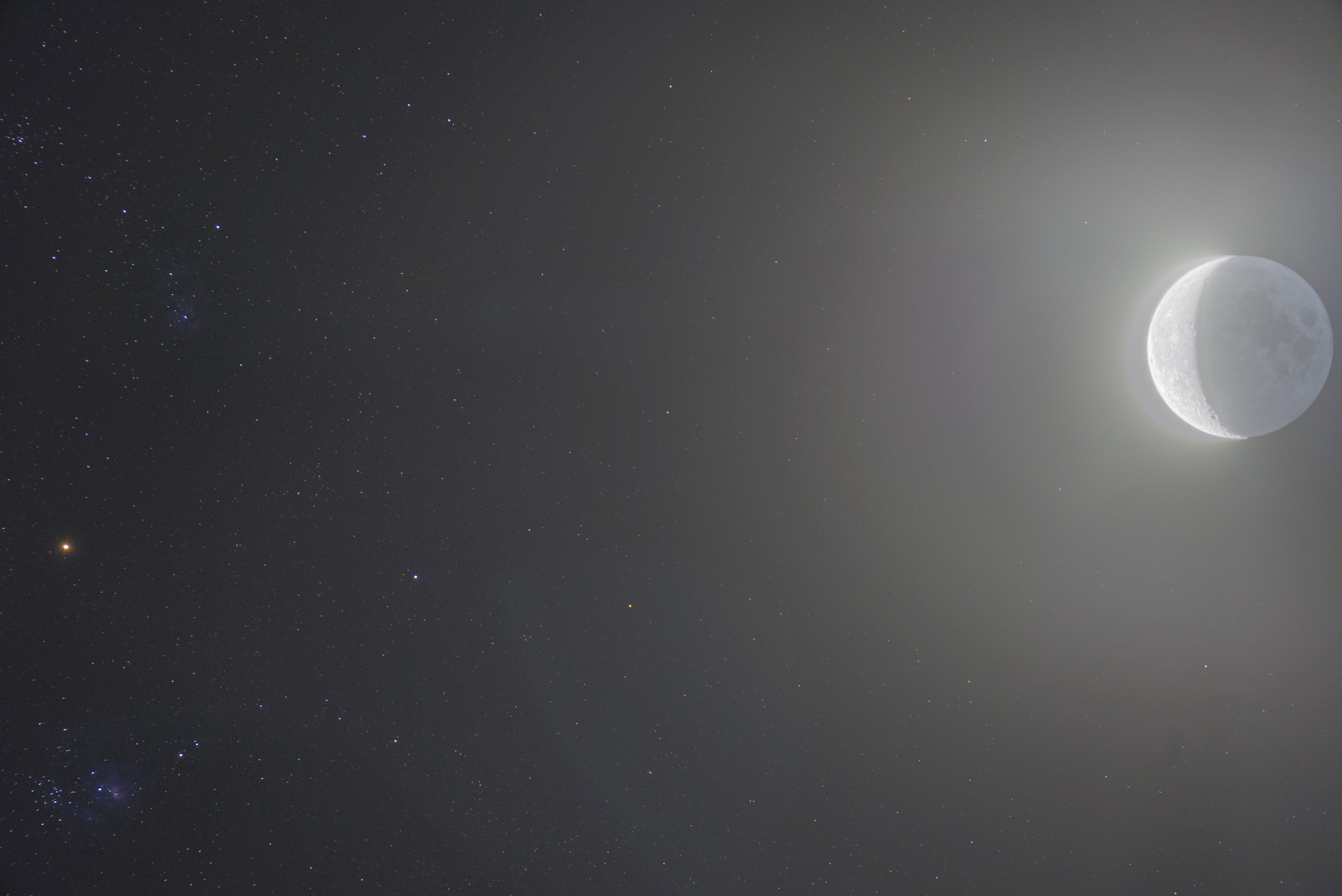 Sobre las 5 de la madrugada, asomaba la Luna menguante sobre los árboles y al poco rato el planeta Marte. En ese momento cambié de nuevo la cámara y puse la Sony para sacar las unas fotos de la Luna. No fue hasta dos horas más tarde que alcanzó la suficiente altura como para intentar fotografiar la conjunción y la verdad es que fue bastante difícil, ya que el brillo de la Luna producía unos horribles reflejos y hacia muy difícil sacar las nebulosas M8, M20 y la Luna al mismo tiempo. Hice lo que pude hasta que la luz del crepúsculo borró las nebulosas y con la luz del alba, comencé a recoger. Mientras recogía tenía una bonita vista de la Luna, marte y Júpiter algo mas alejado.