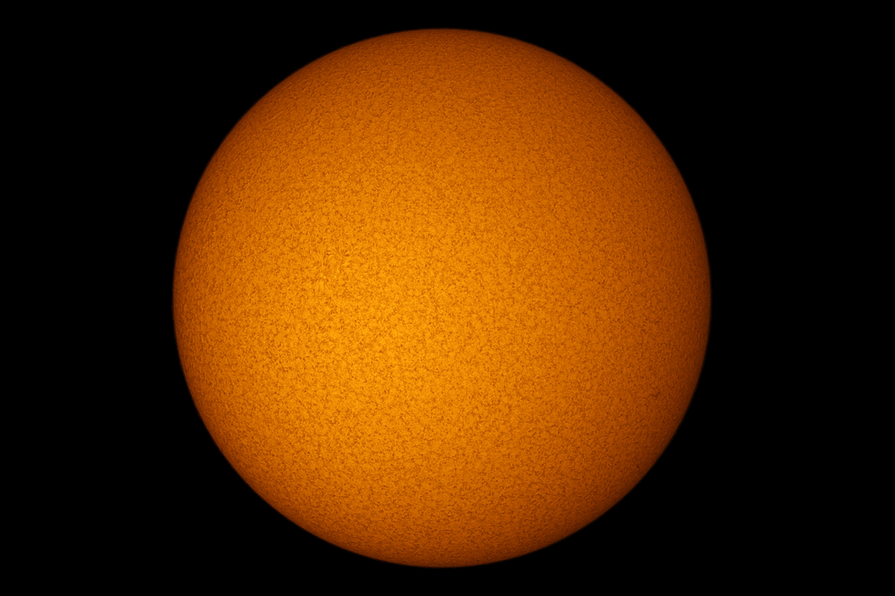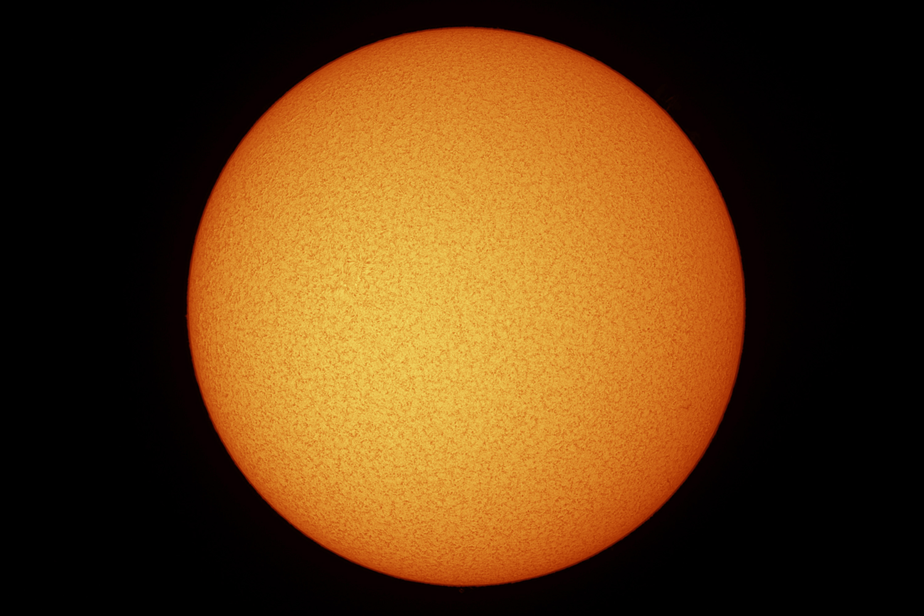 | Imagen del disco solar en H-Alpha | Imagen del disco solar en H-Alpha con menos contraste, donde se aprecia la cromosfera y alguna protuberancia. |