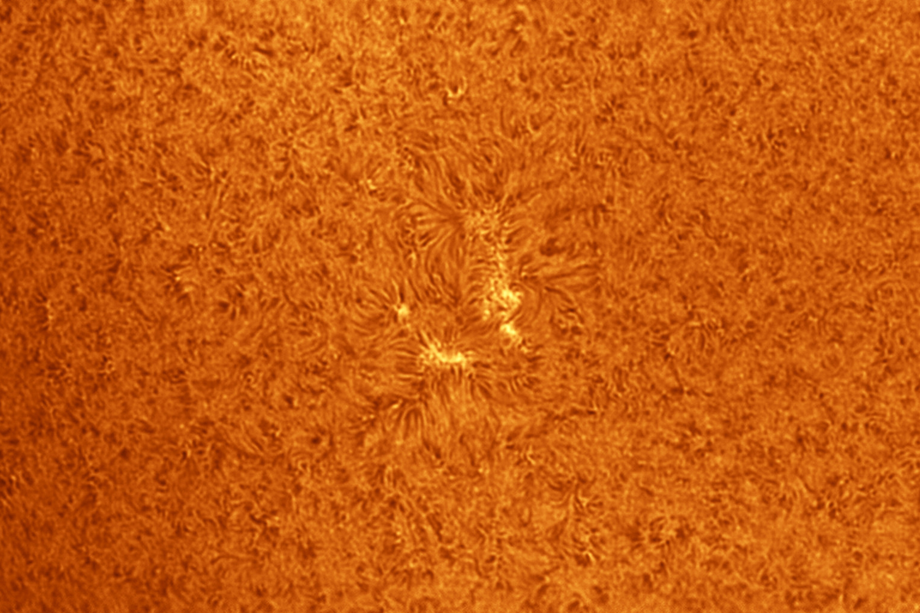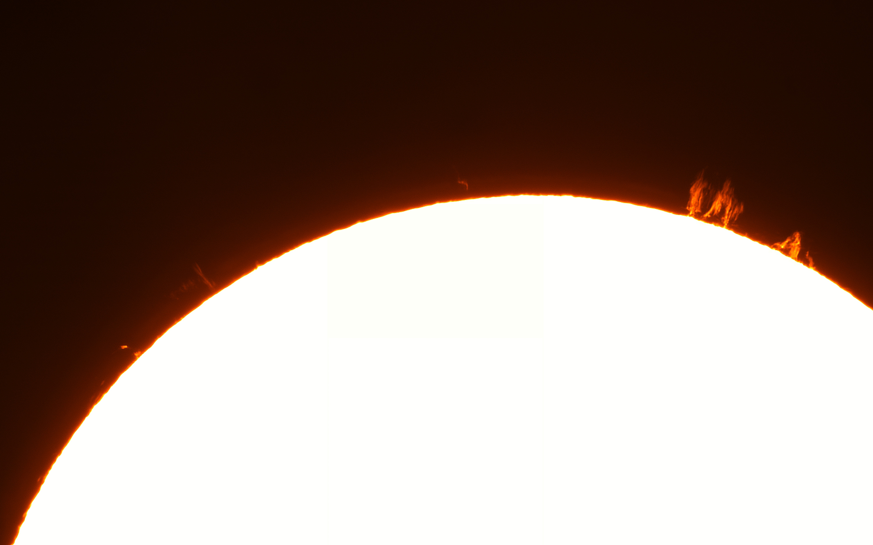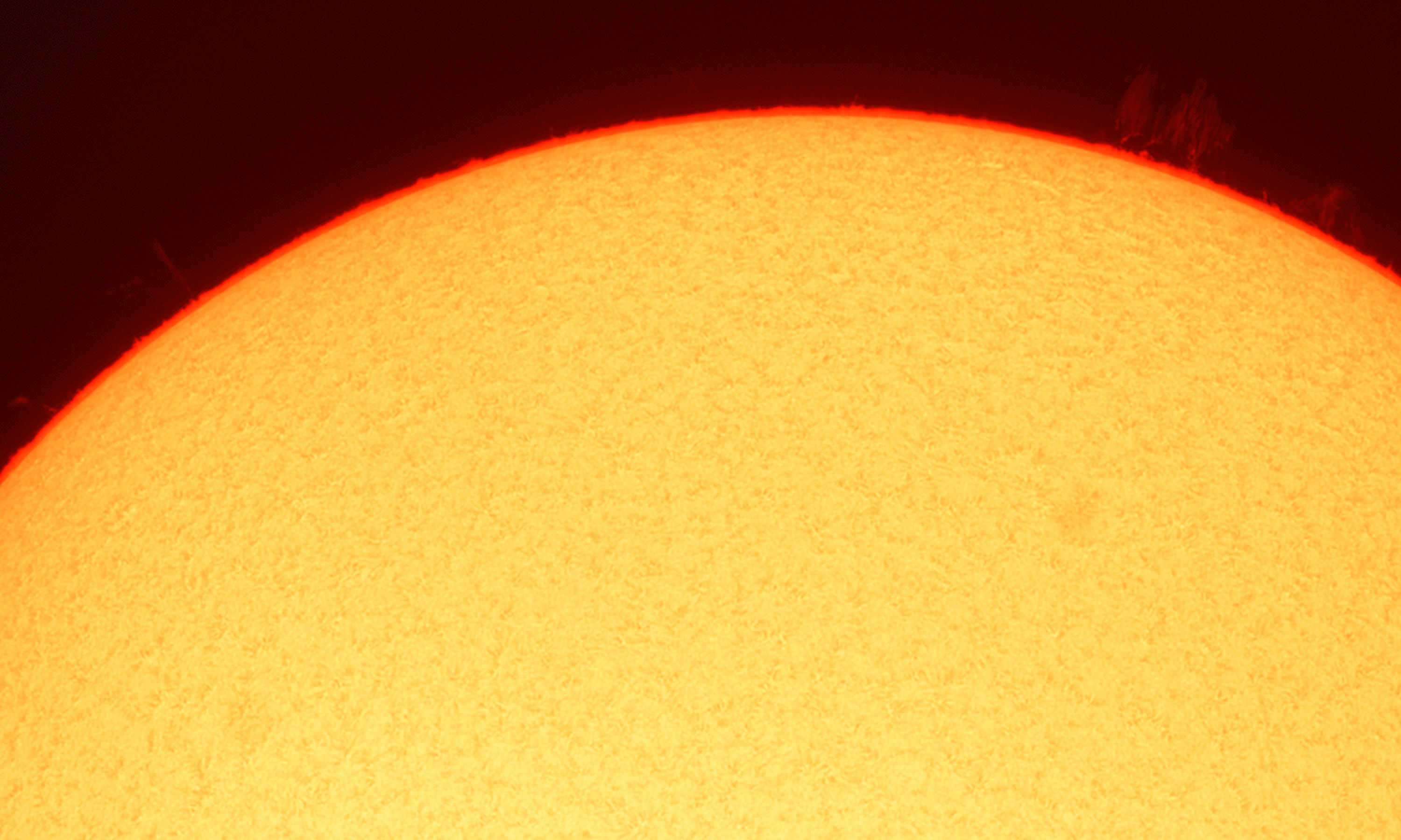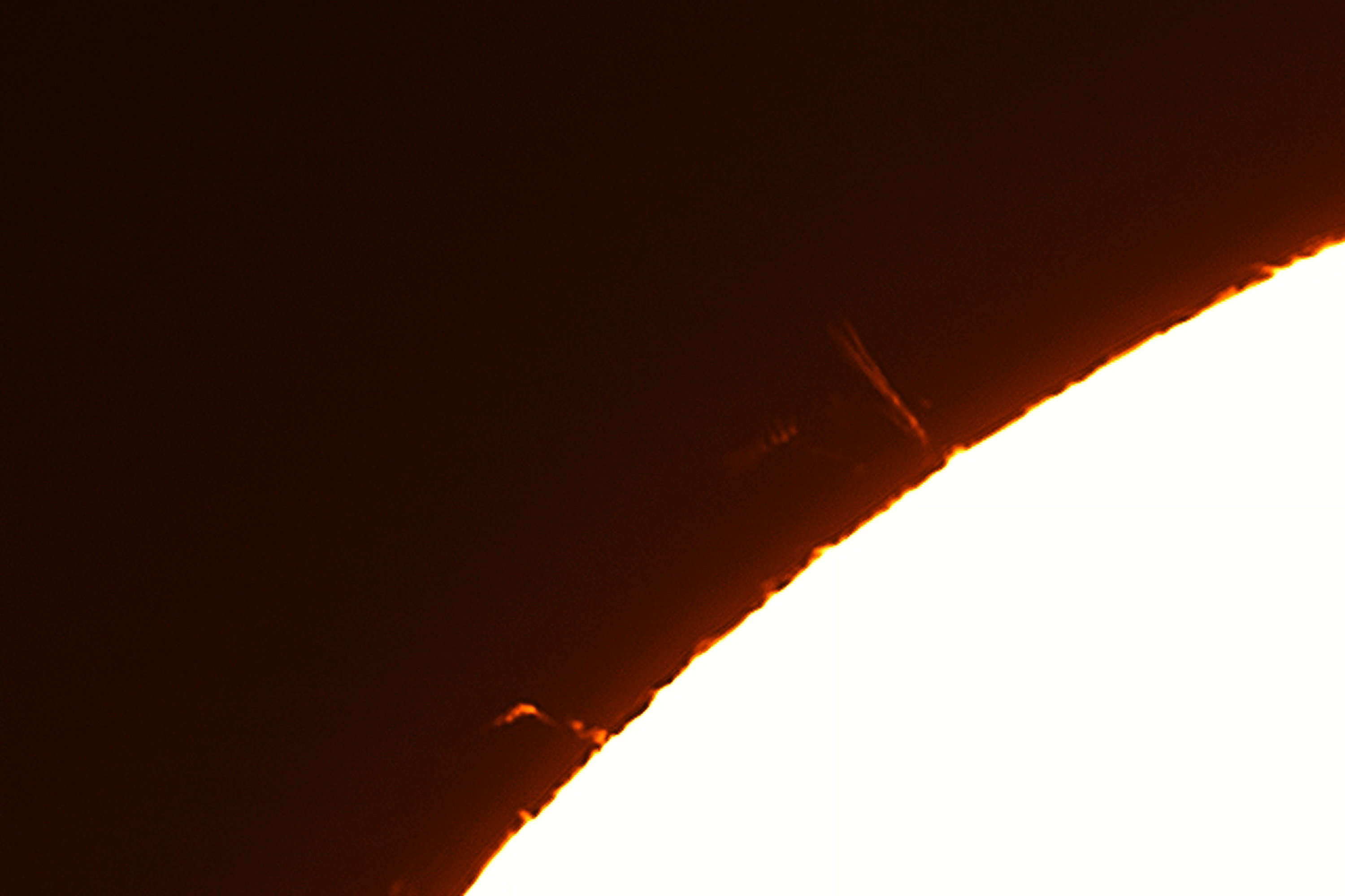 Aunque la mancha solar de los últimos días había desaparecido, aún se podían ver sus restos en h-alpha, como una pequeña perturbación en la cromosfera. A parte de eso, lo más destacado fueron varias protuberancias que aunque en un principio parecían muy débiles en la página de GONG, cuando puse la CCD y la exprimí un poco, se pudo sacar muchos detalles. A destacar, una región donde había tres protuberancias grandes y bien desarrolladas y otra protuberancia muy finita y alargada, algo mas separada. Aunque recorriendo todo el disco solar, se podían ver algunas más.