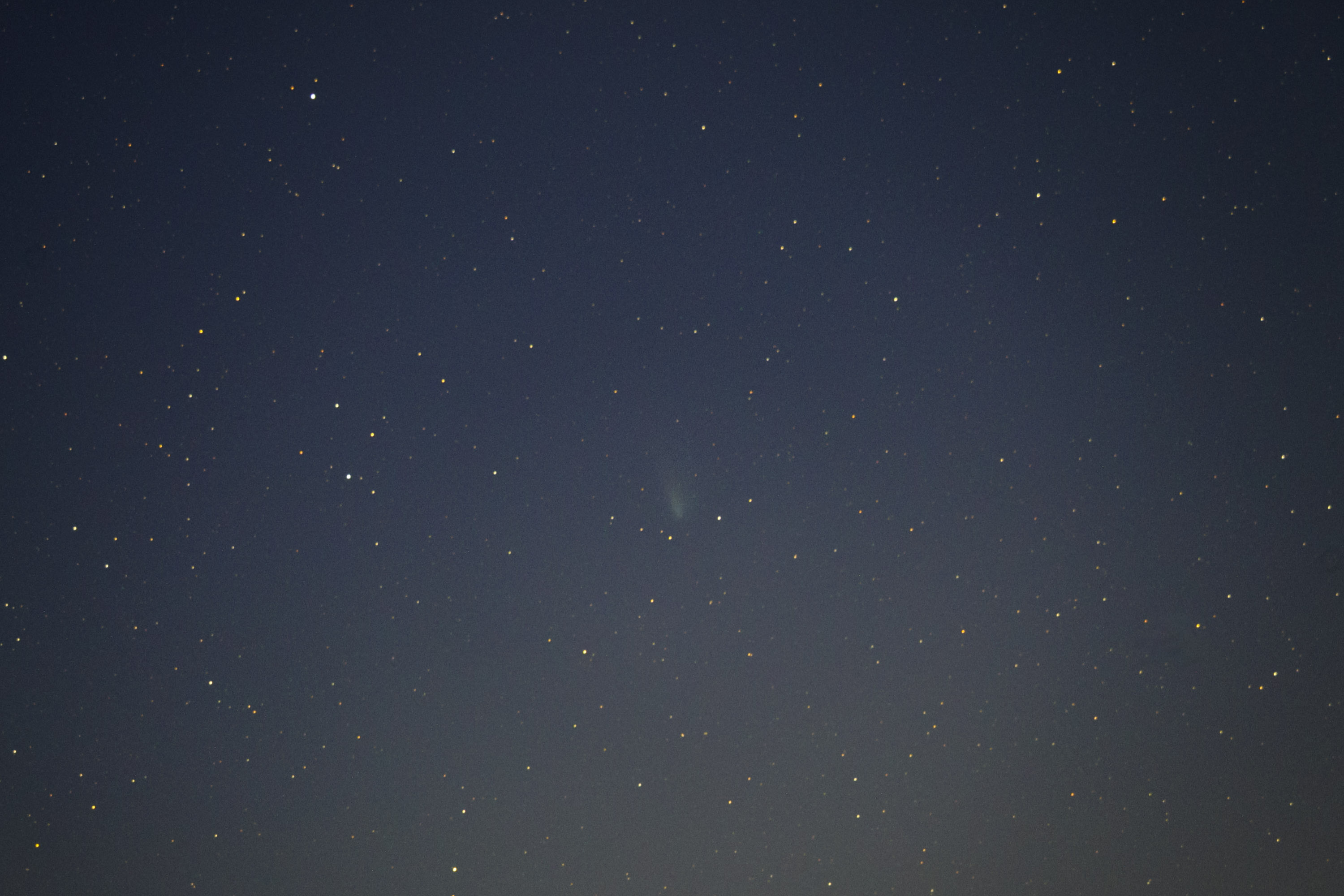 Ya con el crepúsculo astronómico a las puertas, volvimos a cambiar la cámara y puse la mía de nuevo para fotografiar el cometa C/2020 F8 (SWAN) que estaba ascendiendo por el horizonte Noroeste. Menos mal, que justo por esa zona se estaban retirando las nubes y nos iban a permitir sacar fotos del cometa. Pero la suerte se quedó ahi... porque la casualidad quiso que el cometa apareciera justo al lado de unos cables de unos postes de teléfono/luz y para colmo, la trayectoria del cometa durante buena parte de las fotos, seguía la trayectoria de los cables. Por lo que hacía prácticamente imposible fotografiar el cometa. Al final, con luz del crepúsculo, decidí mover la montura unos pocos metros a la izquierda, para salvar los cables y funcionó. Solamente me tocó volver a alinear, volver a encuadrar, volver a enfocar,... y para cuando tenía todo listo, la luz del crepúsculo era lo suficientemente fuerte como para limitarme los tiempos de exposición o el ISO. Una lástima, ya que si me hubiera puesto ahí en un principio, habría aprovechado bien la media hora de oscuridad para darle más exposición y poder sacar así algo mejor el cometa. De todas formas, en las fotos, el cometa parece que se estuviera desintegrando, ya que no hemos sido capaces de fotografiar el núcleo brillante, sino solamente una mancha borrosa y alargada. Y por su puesto, mucho menos brillante de lo esperado.