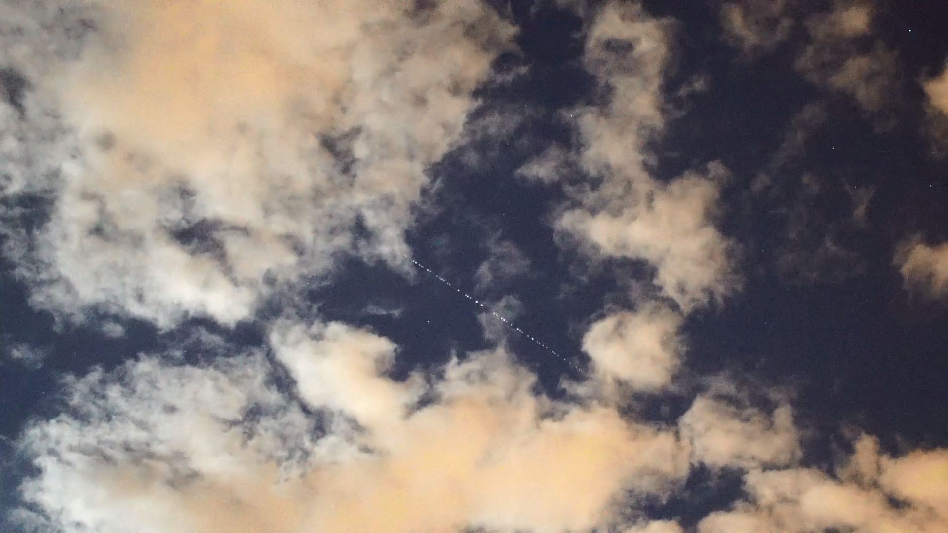 El relato: Hace menos de 24 horas que SpaceX lanzó los "Starlink 7" desde el centro espacial Kennedy en Florida. Concretamente a las 03:25 del 4 de Junio. A los pocos minutos del lanzamiento los satélites entran en órbita y comienzan a separarse poco a poco. Como decía, menos de un día después, sobre las 23:08 del 4 de Junio, realizan un pase favorable que los hace visibles desde España. Quería aprovechar hoy para observarlos, ya que aun están bastante juntos y es un espectáculo verlos. Salí de casa a las 23:00 y crucé la calle para verlos sin edificios delante. El cielo estaba nublado en gran parte, y solamente había pequeños huecos donde se veía alguna estrella. La Luna brillaba con fuerza, al estar a menos de un día de la Luna llena y eso hacia que el cielo no fuera oscuro, sino de un tono azulado. Como los satélites pasarían brillando bastante no habría problema para observarlos.