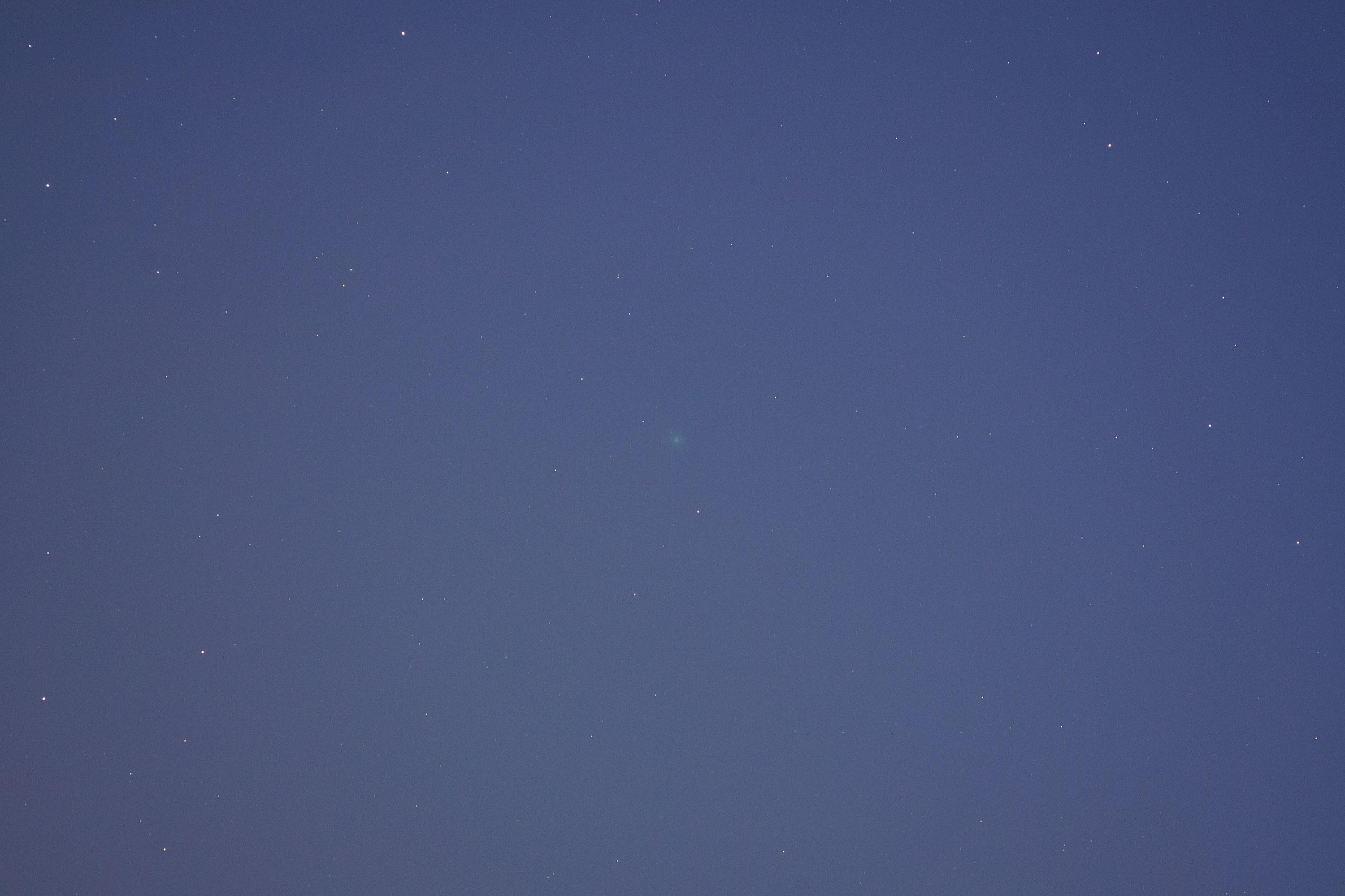 Con el equipo montado, intenté tirar al cometa 2P/Encke, pero el cielo aun estaba demasiado brillante, así que me tomé un tiempo para alinear y después volví al cometa. ya se había ocultado por el horizonte y aun había mucha luz, así que apunté a por el objeto principal de esta noche, el cometa C/2019 U6 (Lemmon). Aunque con dificultades por el crepúsculo, y después por la luz de la Luna, finalmente lo pude fotografiar. No se le aprecia cola, pero si que se ve menos la coma. Dejé la cámara sacando fotos mientras yo me deleitaba con los rayos que cada vez ocurrían con menor frecuencia. Finalmente el cometa bajó tanto, que fue imposible seguir fotografiándolo. Curiosamente , lo mejor que he conseguido y que finalmente he puesto en el artículo es una sola foto, sin apilado. Después estuve sacando alguna foto al cometa C/2017 T2(PanSTARRS) que pasaba por delante de un par de galaxias. La luz de la Luna hacía imposible sacar poco más que un puntito moviéndose entre las galaxias, pero nada de cola. Incluso estando más alto que el otro cometa y en una zona más oscura, se veía peor, por lo que considero que este último tiene bastante menos magnitud visual que el anterior.