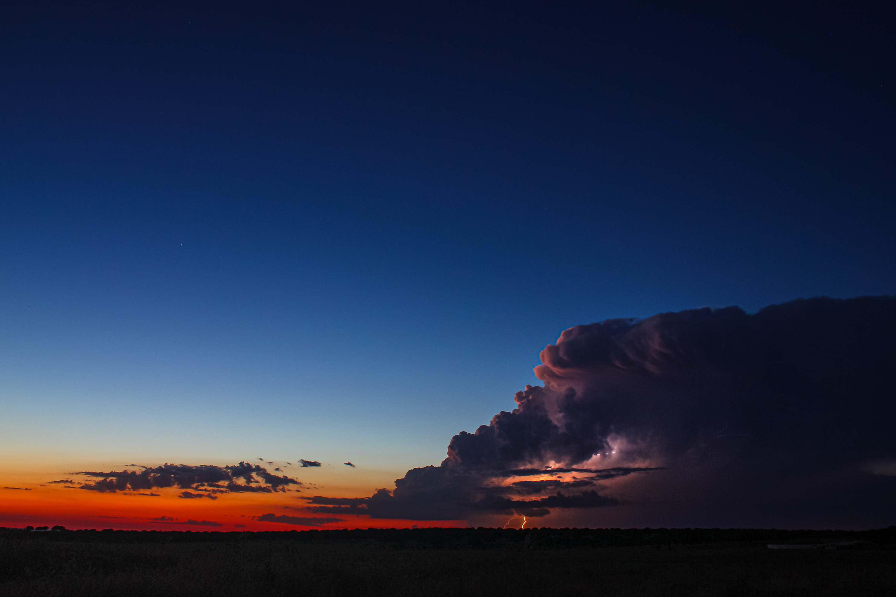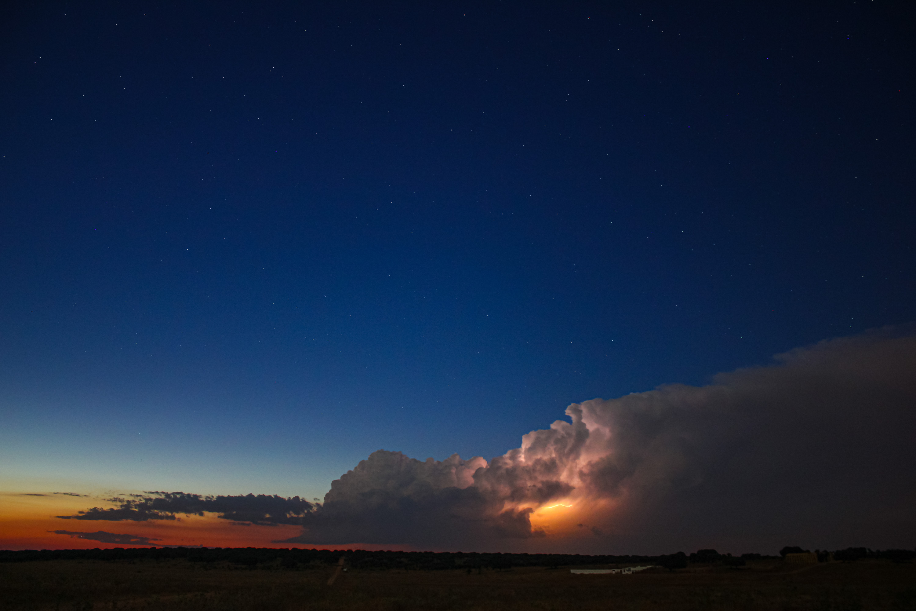 Rayos vistos en la tormenta durante el anochecer, donde ya se ven algunas estrellas en el cielo. |