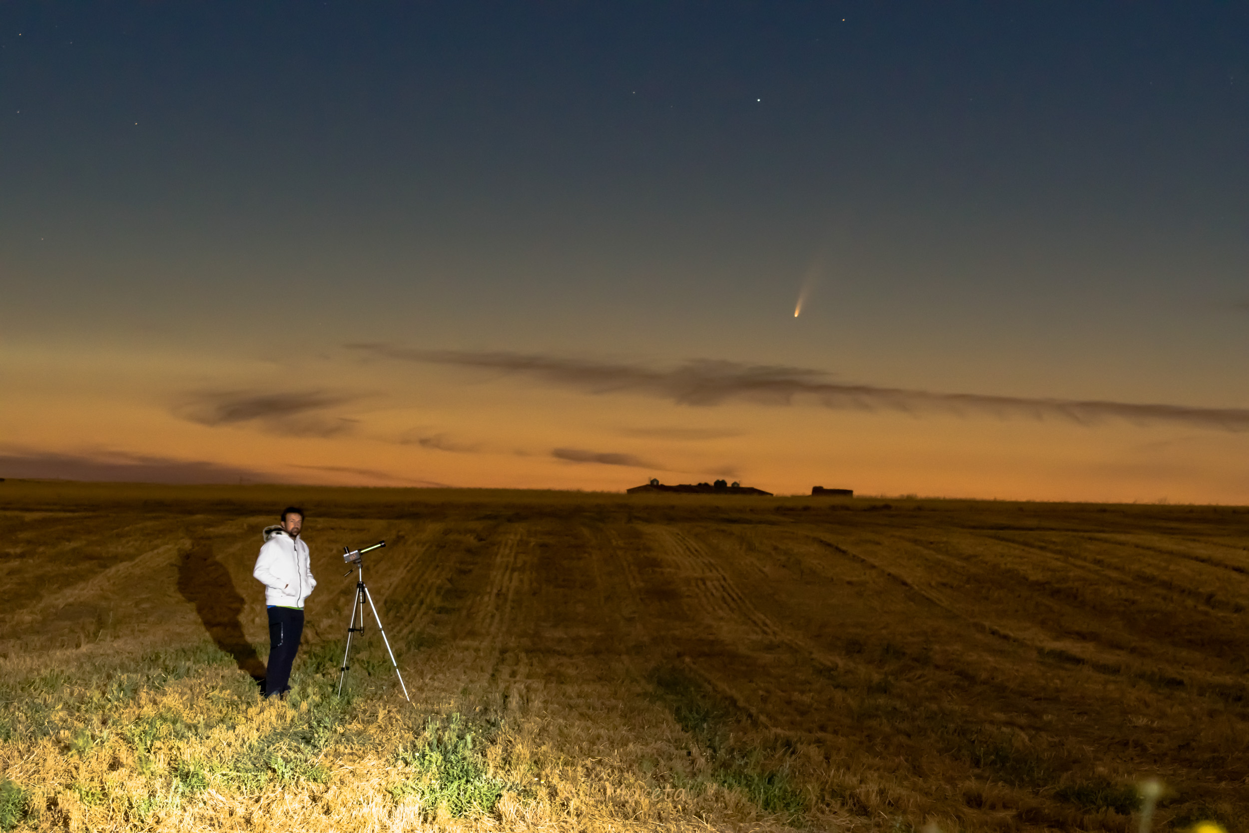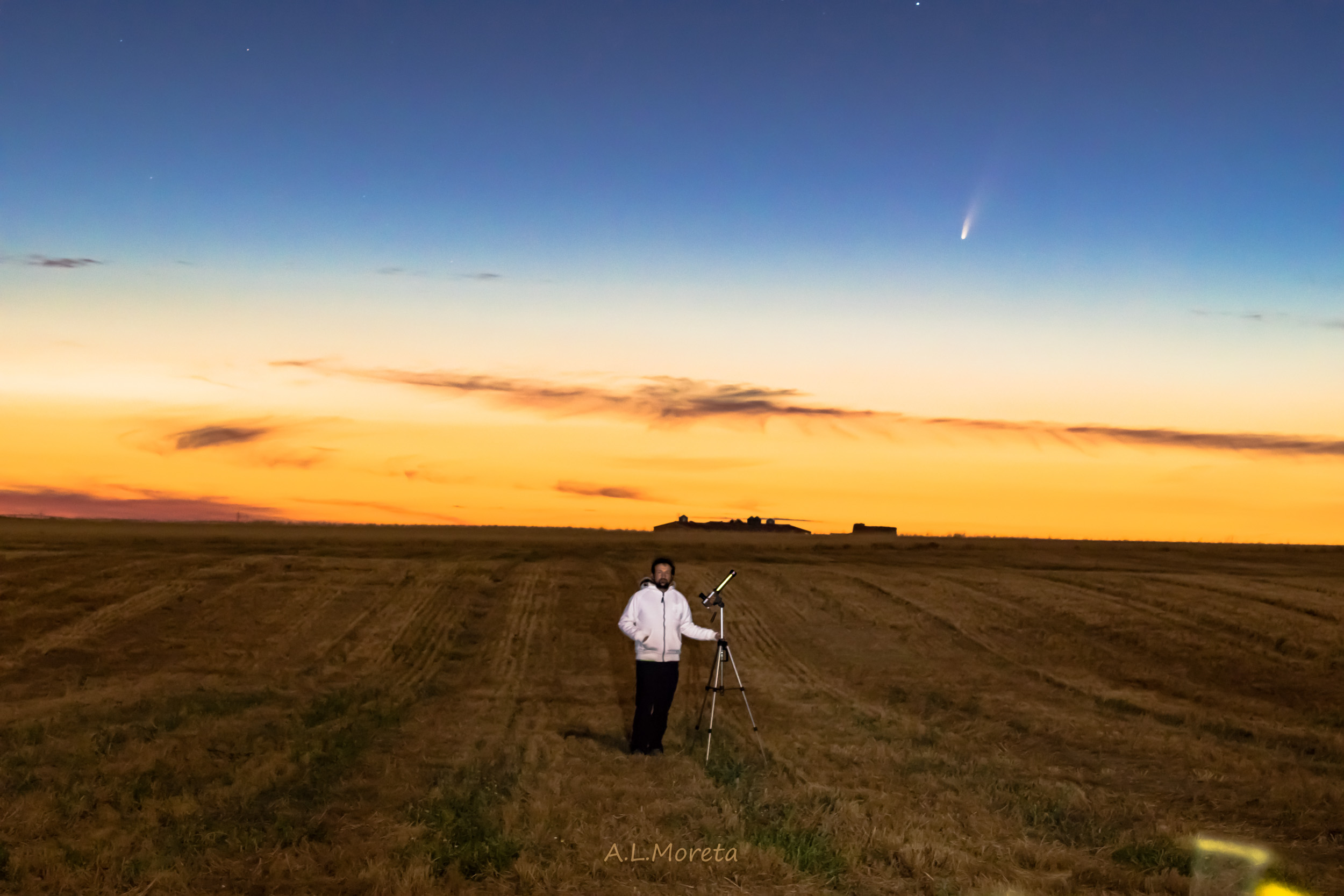 Los comentarios eran acerca de lo grande y bien que se veía el cometa. Yo estuve fotografiando el cometa con distintas cámaras y se veía perfectamente cómo la cola era bastante más grande, llegando a abarcar el campo completo del sensor con el telescopio ED 80. Esta noche hemos aprovechado para sacarnos unas fotos junto al cometa mientras mirábamos por un telescopio a lo lejos. Estuvimos yendo todo el rato el cometa en visual y con prismáticos hasta que No obstante altura y la luz del crepúsculo avanzaba. Hoy quité ante las cámaras de fotos para poder observar un rato y cometa con el ocular del telescopio. Aunque tengo que decir que la mejor versión del cometa ir a través de los prismáticos. Estuvimos observando el cometa hasta pasadas las 06:30 de la madrugada.