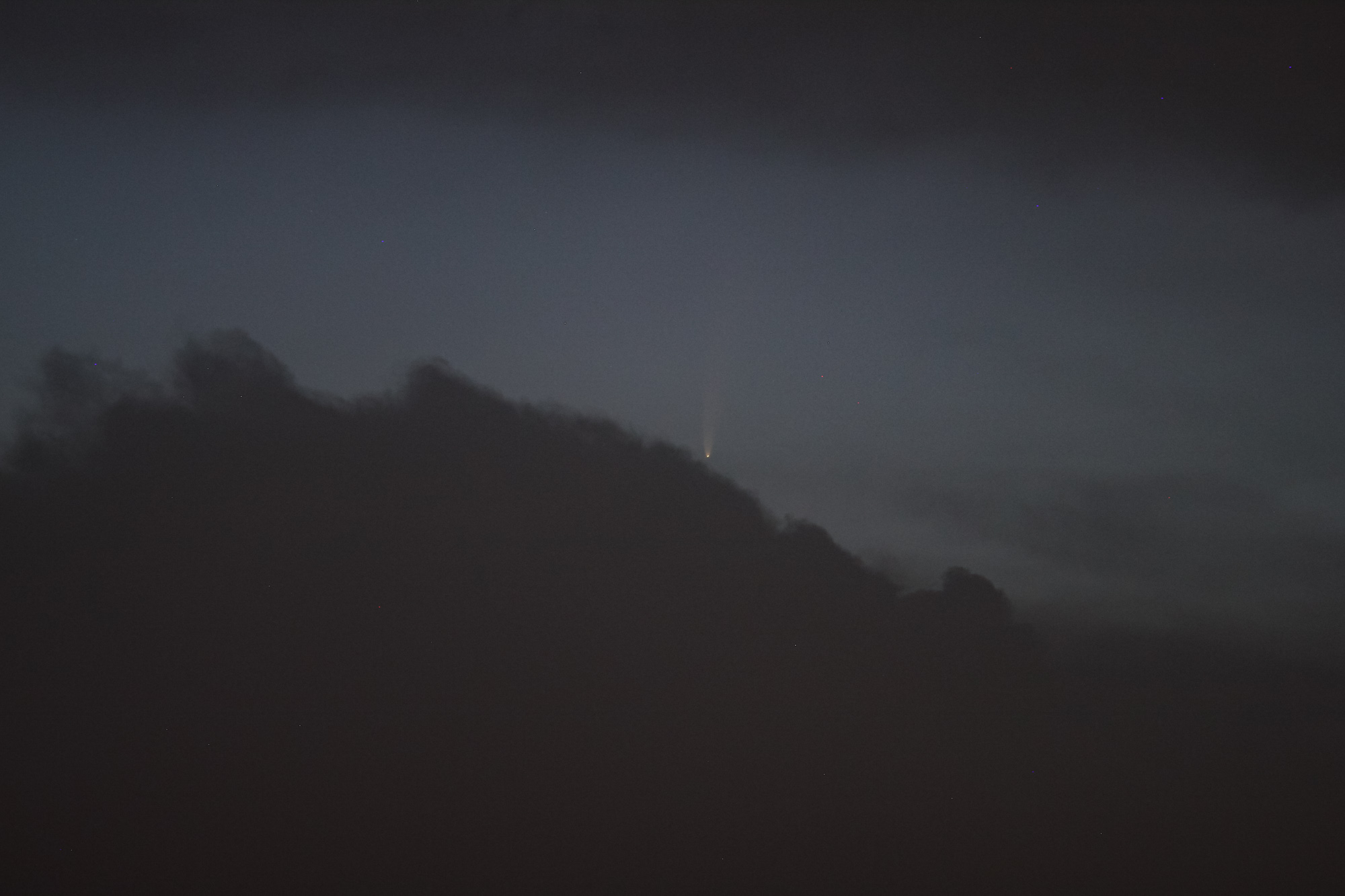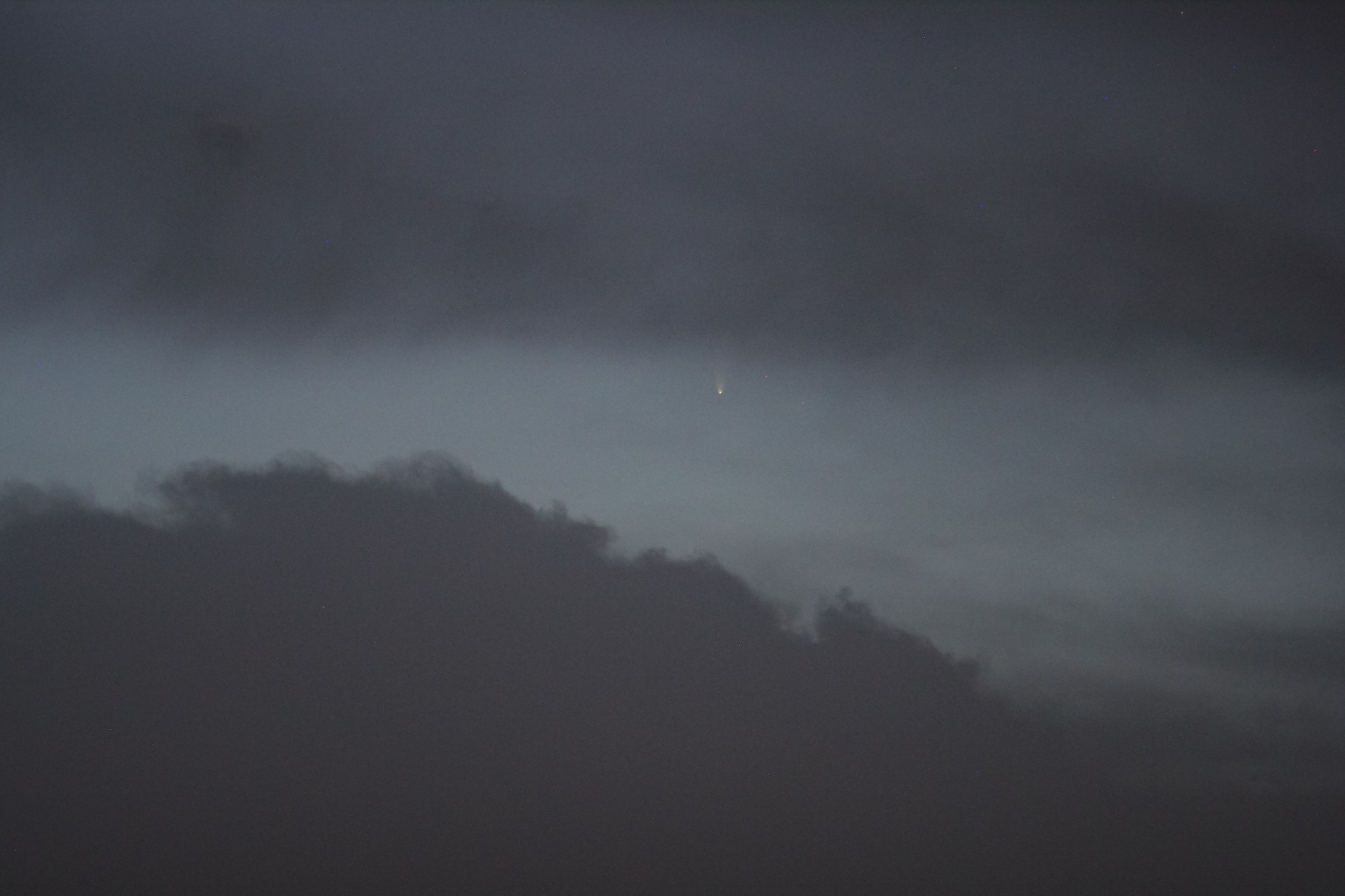 Otro día mas venimos a observar el cometa C/2020 F3 (NEOWISE) Hoy ha sido una un desastre de observación, Cuando llegué estaba el cielo completamente nublado, No hacía nada de viento y si mucho calor. parecía según las imágenes del satélite que las nubes se iban a retirar en gan medida, y así fue, pero con la mala suerte de que el cometa estuvo todo el tiempo cubierto de nubes. Miguel Ángel y una compañera también se acercaron a la ermita y estuvimos charlando todos durante la noche mientras estábamos sentados descansando y con los trípodes y cámaras preparadas. Estábamos atentos de las nubes por si aparecía el cometa pero nada... no había suerte, las nubes estaban como estancadas en esa zona y parecían no moverse. Finalmente tuvimos una pequeña "ventana de observación" de tan solo 4 minutos en los que pudimos fotografiar el cometa, concretamente desde las 05:56 hasta las 06:00. Muy un lapso de tiempo extremadamente corto y solamente pudimos sacar unas fotos con la luz del crepúsculo. Por desgracia ni si quiera dio tiempo para verlo a simple vista o con los prismáticos. Estuvimos un rato más, pero cada vez había mas luz y las nubes eran mas densas en la zona del cometa, así que decidimos recoger y marcharnos pasadas las 6:30