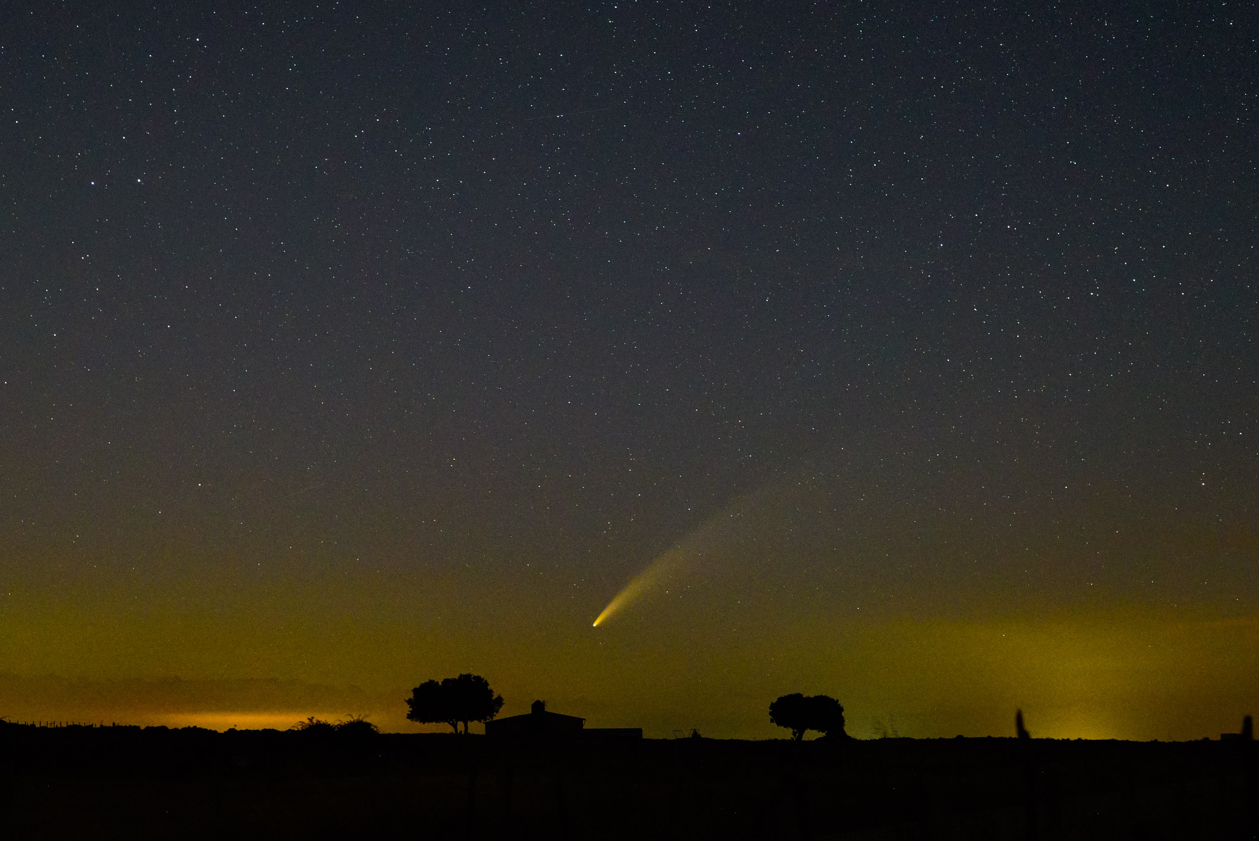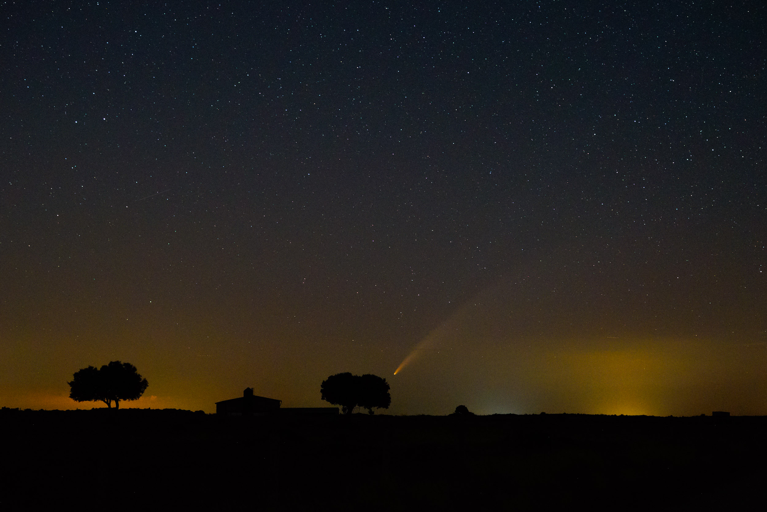 El relato: Hoy he vuelto a repetir sitio para ver el cometa C/2020 F3 (NEOWISE) de madrugada. Como desde Salamanca estamos teniendo problemas con las luces y el polvo de las cosechadoras he venido hasta aquí. Es un sitio muy oscuro y con un horizonte libre de obstáculos.