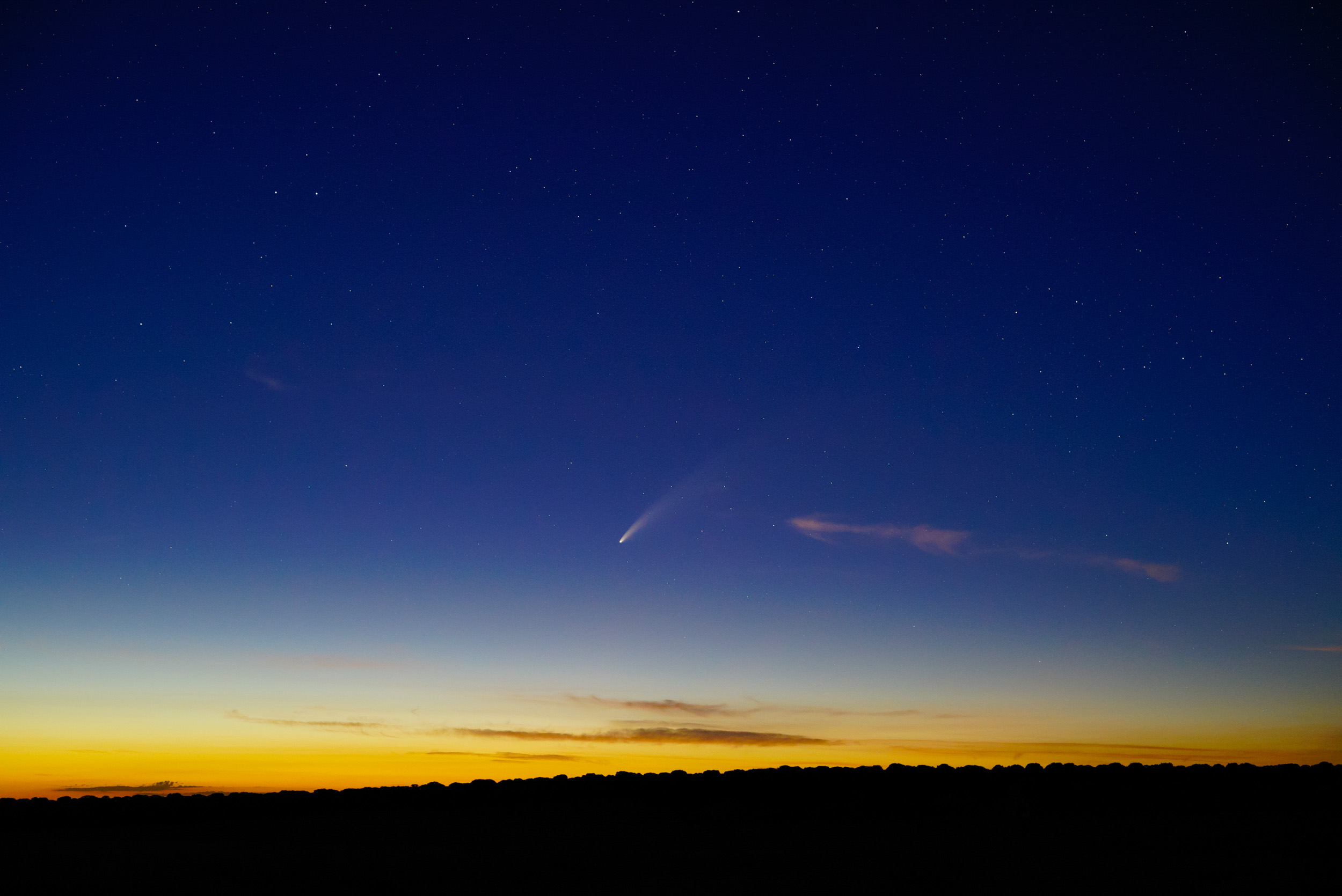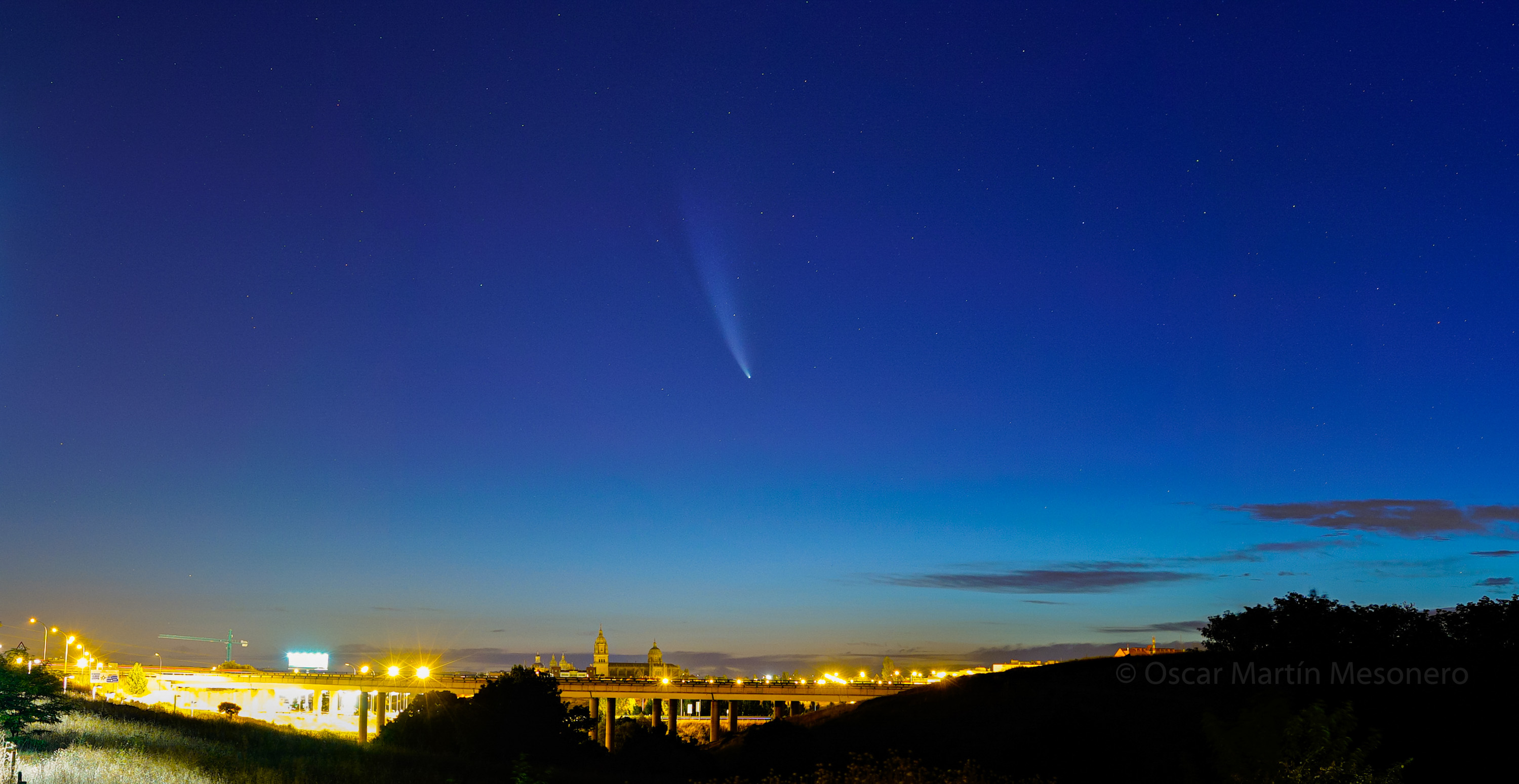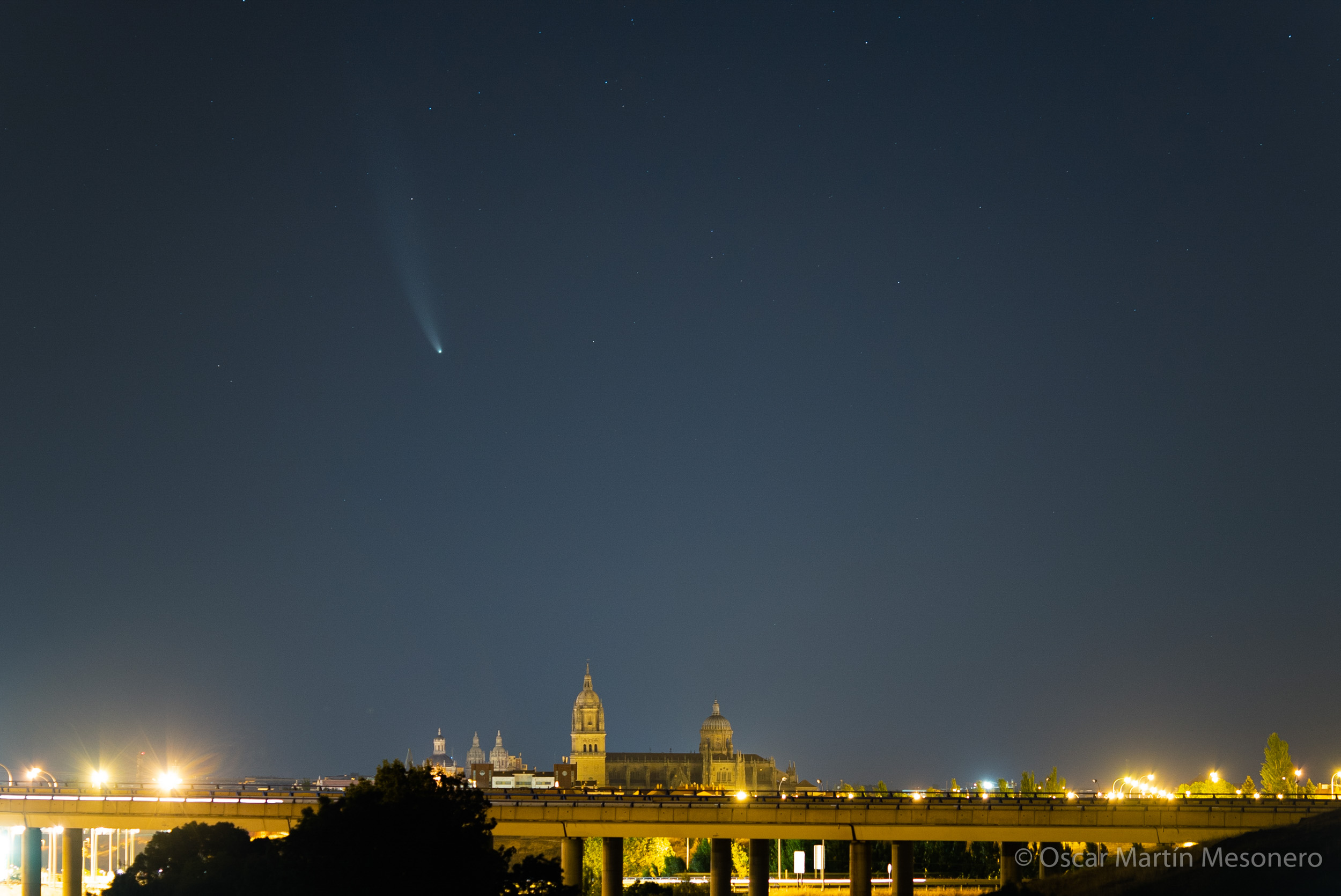 De madrugada, volví a salir a por el cometa, ya que me quedé con ganas de tener una fotografía del cometa y la catedral de Salamanca. Sobre las 4 de la madrugada salí de nuevo y fui hasta casi Aldeatejada. Allí me coloqué al lado del carril bici y estuve esperando a que saliera el cometa. Al principio se veía muy mal por la escasa altura y la contaminación lumínica, pero según ganaba altura se iba viendo mejor. Estuve una buen rato sacando fotos y grabando algún que otro vídeo y como no, disfrutando del momento. Finalmente nos alcanzó el crepúsculo ,pero al mismo tiempo una bonita imagen del cometa y la catedral de Salamanca, que a parte de las fotos, se podía ver a simple vista! un bonito recuerdo que sin duda tardaremos en volver a observar.