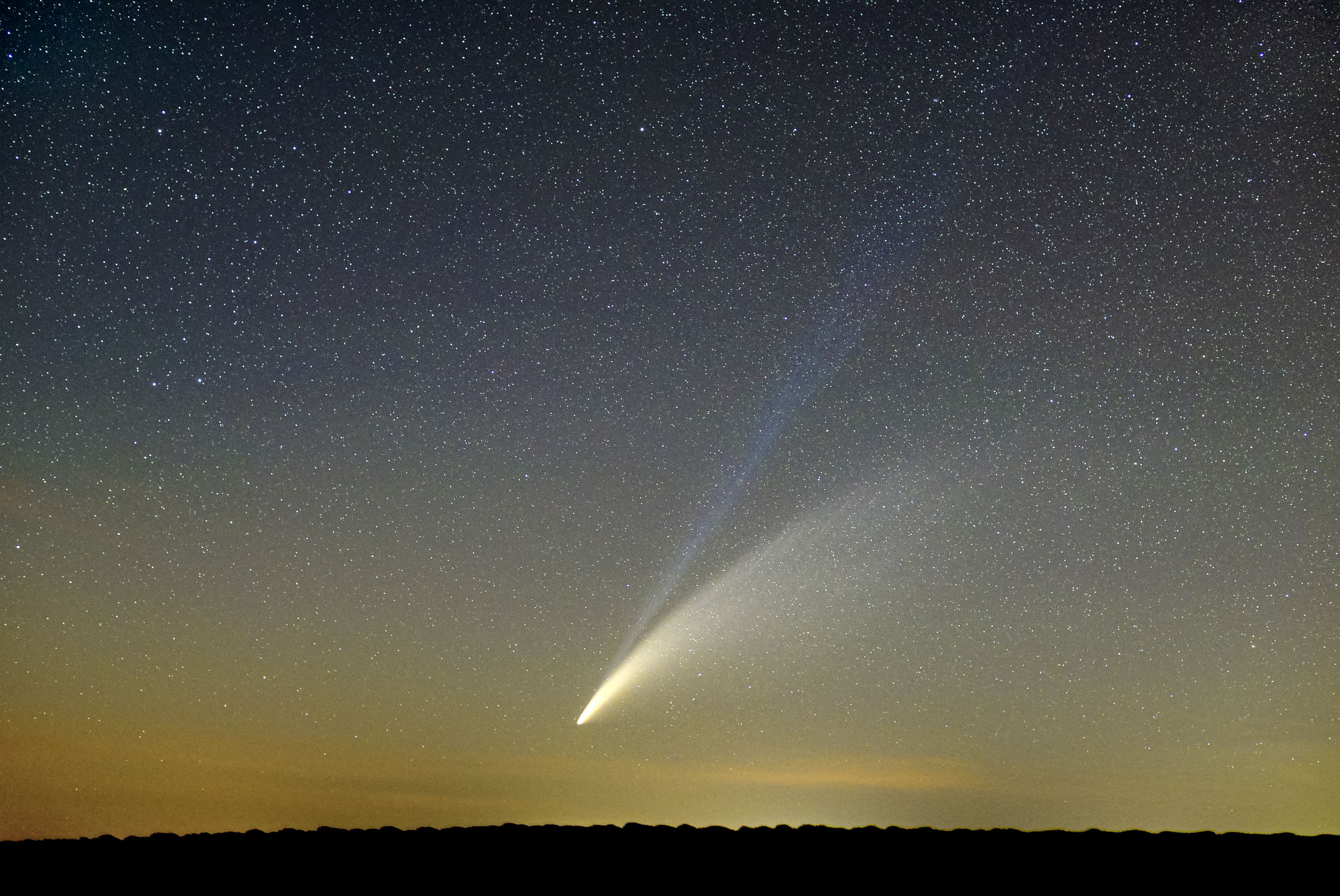 El relato: Hoy he llegado un poquito ante de la puesta de Sol. Me he puesto a montar el equipo y al rato llegó Manu, que había quedado con el para que viera el cometa C/2020 F3 (NEOWISE) . Hemos esperado a que apareciera la polar para poder alinear las monturas y en seguida apuntamos al cometa. ya se veía con las cámaras. A Manu le costó un poco más encontrarlo, pero finalmente lo hizo. Yo estuve todo el rato sacando fotos, pero sobre las 23:20 hicimos un pequeño descanso de cometa. La razón... El pase de la ISS. Hoy teníamos un pase bastante favorable y quise fotografiarlo. Por eso preparé el Dobson de 12" con una barlow 2x y le acoplé la Sony A7s. Estuve siguiendo la estación espacial internacional primero a través del visor, y después por el buscador, mientras iba apretando el disparador para sacar fotos. Lo dejé configurado en ISO 6400 y una velocidad de 1/4000. Y aunque todo pasó muy rápido y en ocasiones era complicado de seguirla, finalmente conseguí unas fotos decentes. Después regresamos al cometa, que ya se veía mucho mejor. Tanto a simple vista, como por telescopio y cámaras. Aprovechamos toda la noche al máximo para hacer fotos del cometa y también alguna foto recuerdo de nosotros. Manu incluso estuvo sacando alguna foto de vía láctea. El cometa se veía muy grande a simple vista. Cada día parece más grande y aunque se supone que ha perdido brillo, se sigue viendo espectacular. La visión con telescopio es majestuosa, mostrando una densa, brillante y larga cola de polvo. La coma se empieza a ver de un color verdoso por la parte delantera, aunque el resto de la cola es medio amarilla blanquecina. Cuando el cometa estaba ya muy bajo, recogimos y sobre las 01:00 nos marchamos a Salamanca.