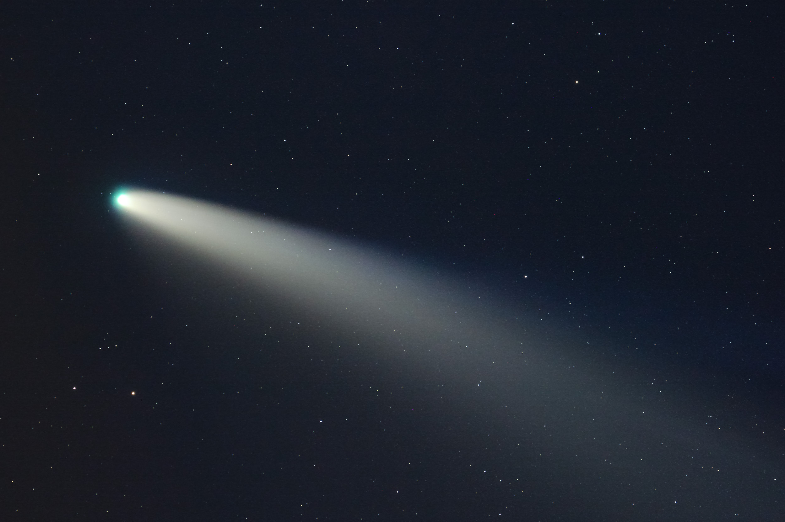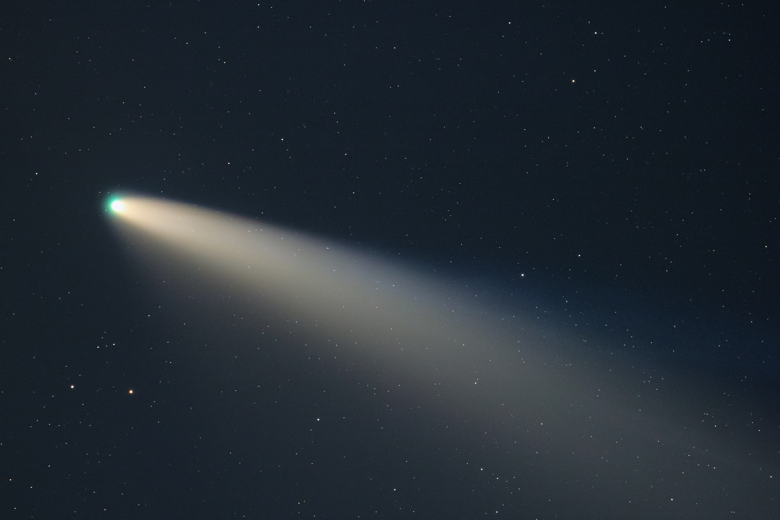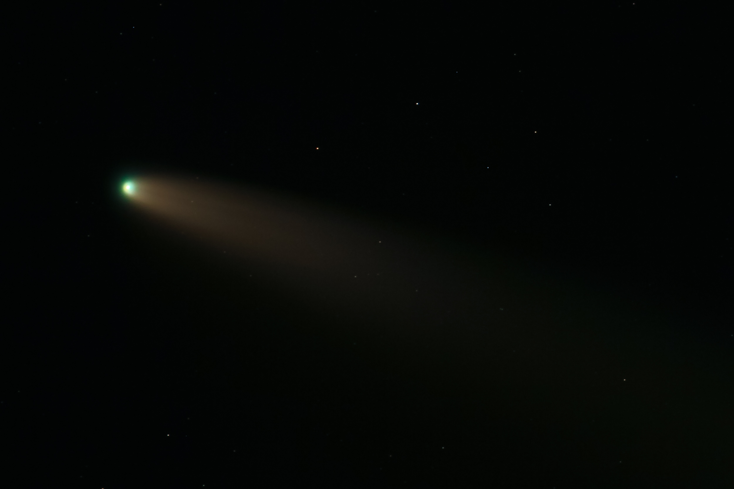 La fotografía ha sido complicada por las dichosas nubes, los satélites Starlink que no dejaban de pasar, las estelas de los aviones, el viento..., pero que le vamos a hacer... otro día tendremos más suerte. Aparentemente el cometa tiene la cola de polvo más grande que en días anteriores, tanto a simple vista, como con prismáticos y en fotografía. Incluso se le aprecia algo de estructura lineal en la cola. La de iones tampoco se queda corta, sigue siendo más larga que la de polvo y también muestra una ligera estructura. A lo largo de la observación se marcharon primero los invitados, y después Pablo. Nos quedamos Sonia y yo apurando las ultimas fotos y sobre la 1 recogimos. A la 1:25 con mucho viento y frío nos marchamos a Salamanca. Por mi parte algo decepcionado por las nubes pero Sonia contenta por las pedazo de fotos que sacó.