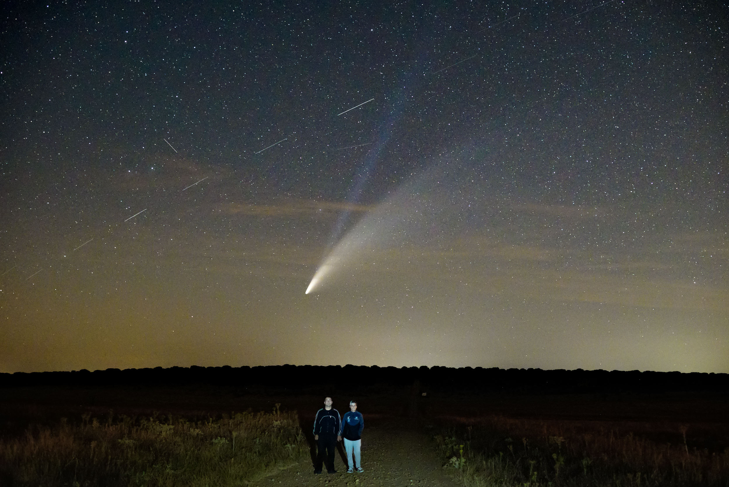 Esto ya parece "Star Wars" mientras estábamos fotografiando el cometa , en cuestión de minutos pasaron decenas de satélites, la mayoría de ellos de la serie Starlink. |