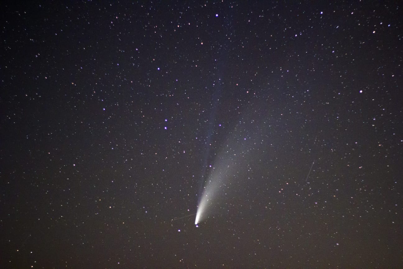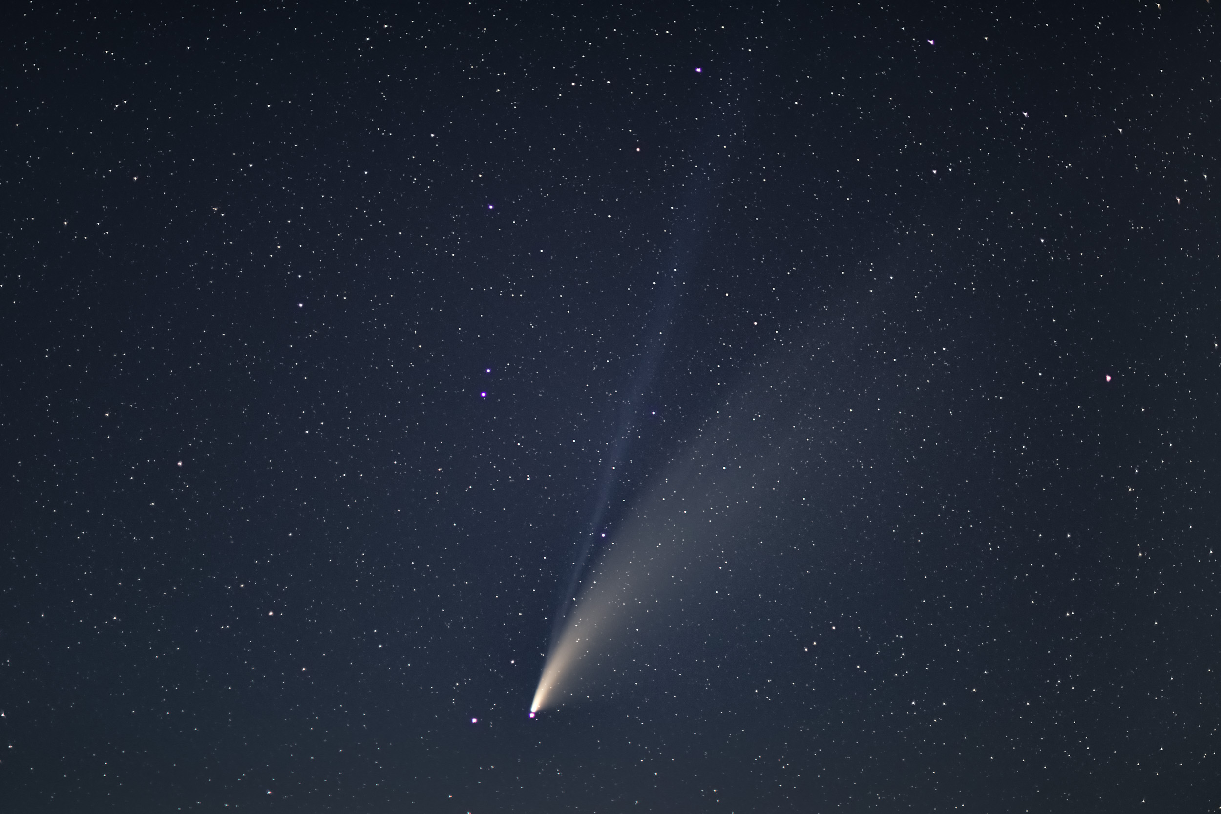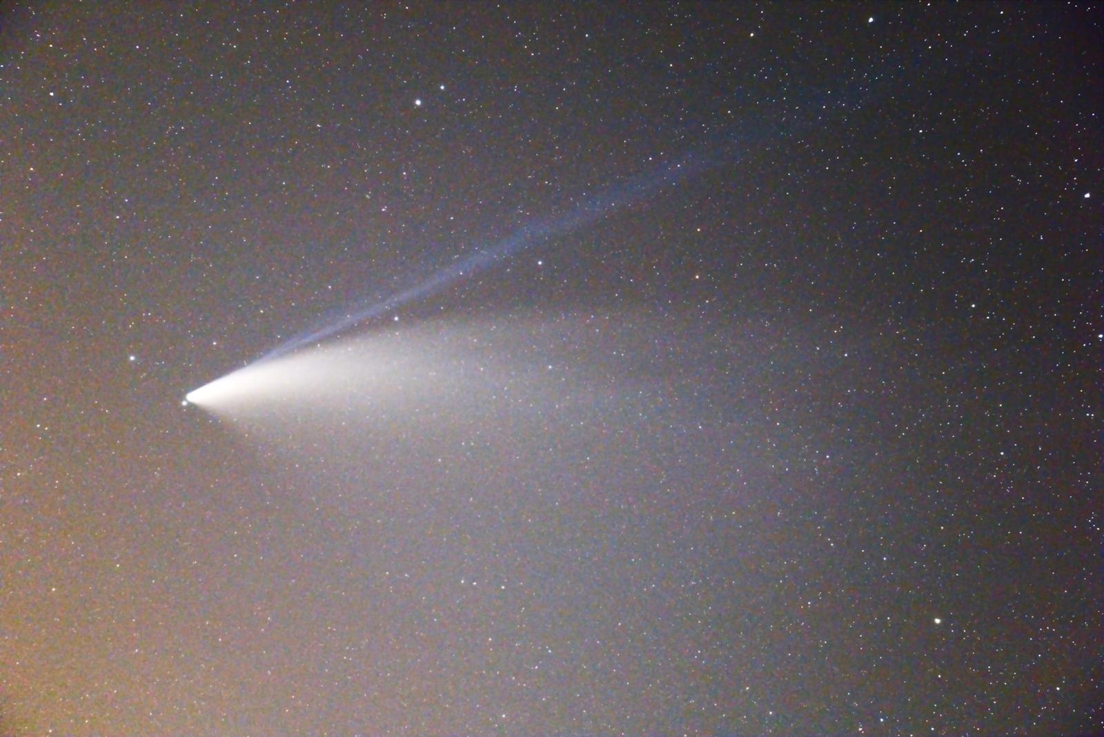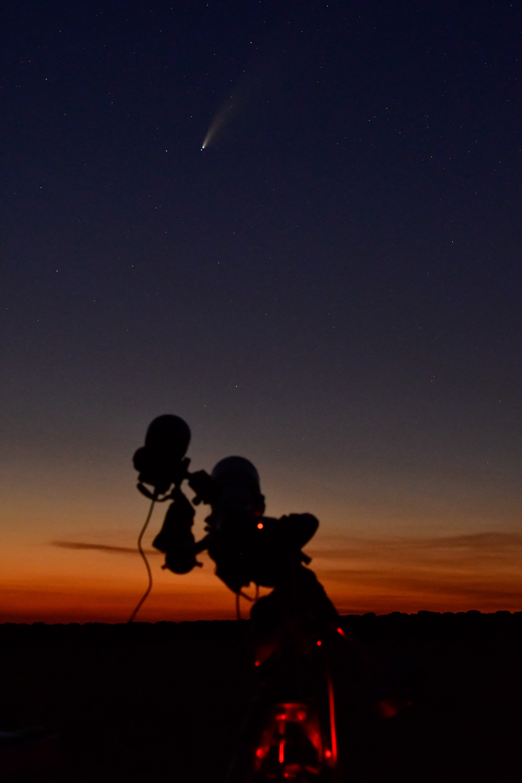 El relato: Hemos llegado poco antes del atardecer, para montar los equipos. Hoy también nos hemos quedado a la entrada del Cueto. Esperamos a la puesta de Sol mientras íbamos montando y después esperamos a que oscureciera para poder apuntar las monturas a la estrella polar. A las 22:45 lo hicimos y a las 22:46 vimos el cometa C/2020 F3 (NEOWISE) a través de los visores de las cámaras, y a partir de ahi... sesión de fotos! Localizarlo a simple vista has sido algo más complicado, se nota que va perdiendo brillo, y pese a que teníamos una estrellita justo al lado del cometa, se hizo dificil localizarlo con la luz del crepúsculo. Poco a poco iba oscureciendo y el cometa se veía cada ve mejor, hasta que oscureció lo suficiente para se fuera fácilmente visible a simple vista. Hoy lo hemos comparado con la estrella que tiene al lado nos hemos dado cuenta de todo el brillo que ha ido perdiendo en estos días. Ya nos queda poco de cometa para disfrutarlo. Aún así, sigue siendo fotogénico. Se nota la perdida de brillo, porque el aspecto verdoso de la coma va ganando protagonismo en las fotos. La bruma es más densa que ayer, pero aun así nos está permitiendo sacar algunas fotos decentes, donde se siguen viendo las dos colas de un tamaño considerable.