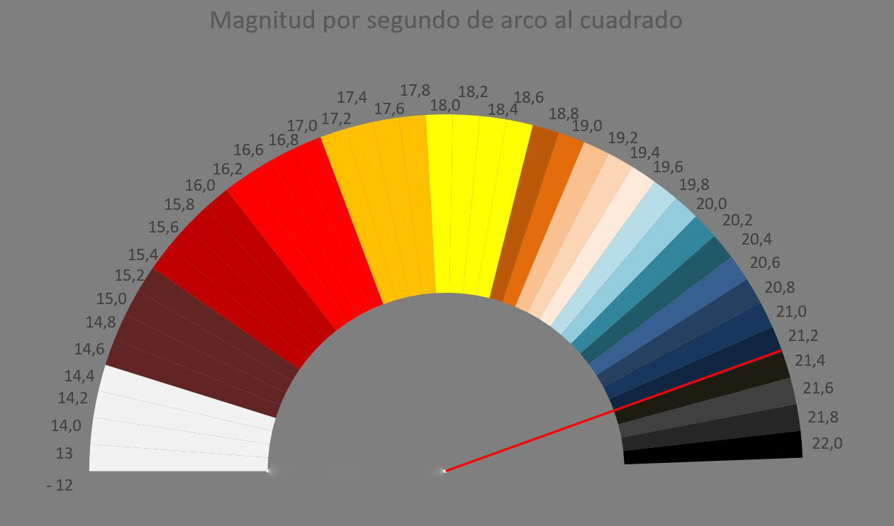 Contaminación lumínica: Realicé un par de medidas de brillo de cielo en el cenit, obteniendo unos valores de entre 21.20 y 21.29