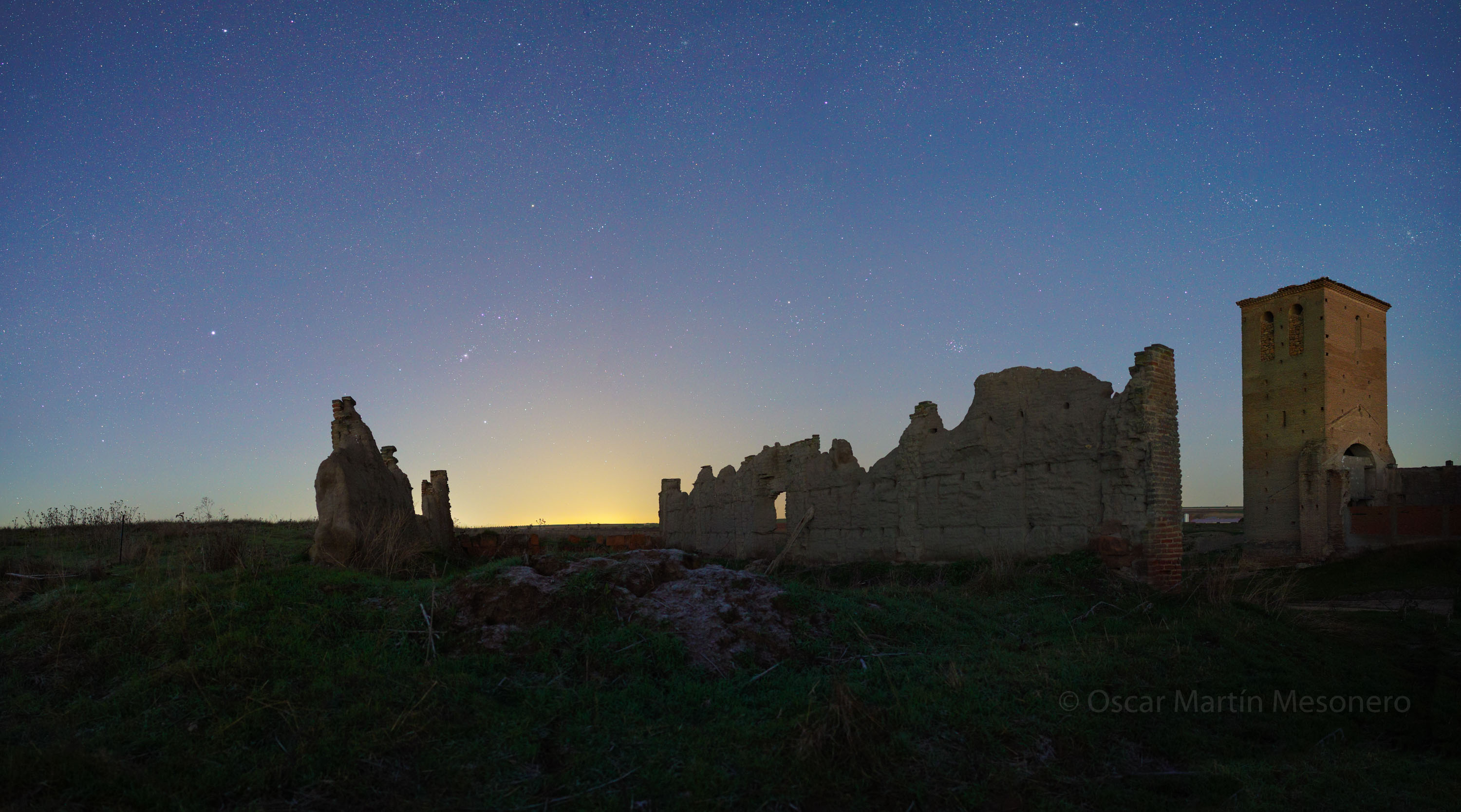 El relato: En realidad hoy he observado en dos sitios diferentes. Salí de Salamanca a las 06:00, justo cuando finaliza el toque de queda, para intentar llegar al "Azud de Riolobos" a tiempo para fotografiar el cometa C/2020 S3 (Erasmus). Por suerte, llegué antes del crepúsculo. Me situé al lado de unas ruinas de una iglesia y monté rápidamente la montura Star Adventurer. Puse la Sony A7s con el objetivo Rubinar de 500mm F/5.6 Por suerte, no tardé mucho en alinear la montura y pude tirar unas fotos al cometa. Al principio me costó un poco localizarlo y enfocar, pero lo hice a tiempo. Después estuve tirando varias fotos al cometa, donde se veía la coma brillante de color verde y una cola mas larga de color blanco azulada. Estuve apurando hasta que el brillo del crepúsculo me obligo a realizar tomas de poca exposición y un ISO menor. Como ya no iba a sacar más información de el, aproveché a sacar unas fotos de gran campo de la zona del cometa y Venus, con la luz zodiacal y también algunas fotos de gran campo de la zona de Orión, que se veía bastante bien mientras se acercaba al horizonte sobre las ruinas de una antigua iglesia. Cuando el brillo fue demasiado, recogí y proseguí mi camino hasta el punto donde había quedado con Agustín. Un sitio entre Cantalapiedra y Madrigal de las altas Torres.