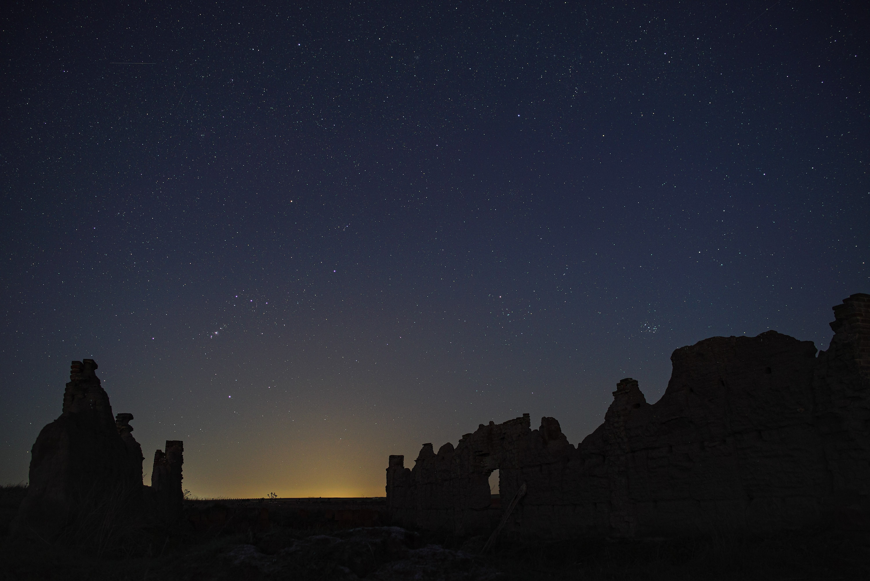 La constelación de Orión y Tauro cerca del horizonte, sobre las ruinas de una antigua iglesia. La luz que ilumina las ruinas y que le da el color azul del cielo es del crepúsculo. |