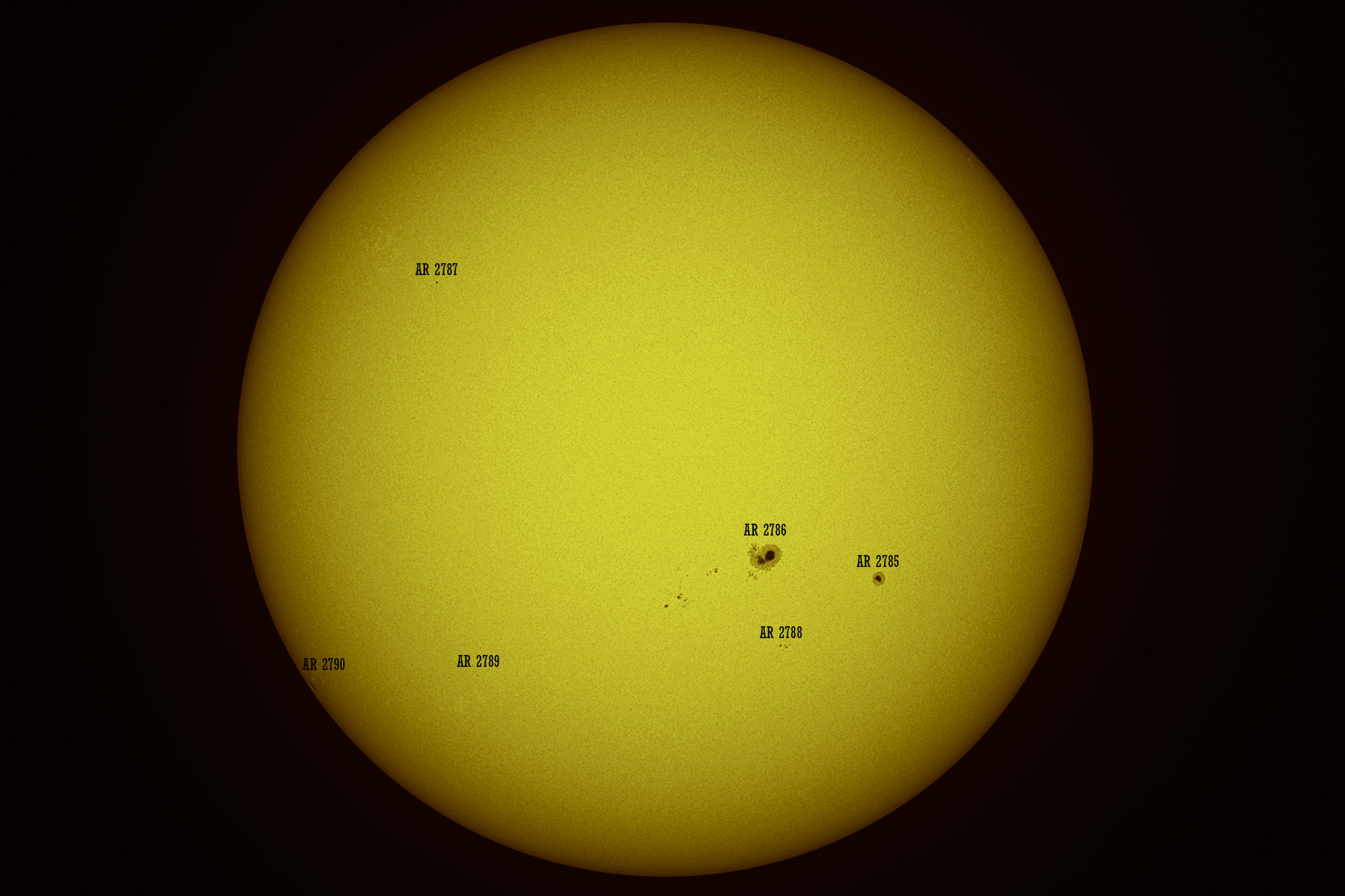 El relato: Aprovechando que el cielo estaba mas o menos despejado, decidí salir a observar el Sol. Salí a la calle de los Mozárabes y lo primero que hice fue poner el ED80. Con el saqué alguno vídeos de disco completo para ver las diferentes manchas solares y luego utilicé una Barlow 2x para sacar las manchas solares con mas detalle.La mancha 2786 sigue con buen tamaño, tanto que incluso es visible a simple vista (con filtro solar), sin necesidad de utilizar telescopio. Parece que ha evolucionado y se está dividiendo en dos. Veremos en los próximos días si se cumple. La 2785 sigue mas o menos igual que en días anteriores y el grupo 2786 parece que disminuye. La 2787 y 2789 aparecen como dos pequeños poros aislados y a penas perceptibles a no ser que uses aumentos. Me ha parecido ver que está apareciendo otra mancha solar por el Este del disco solar.