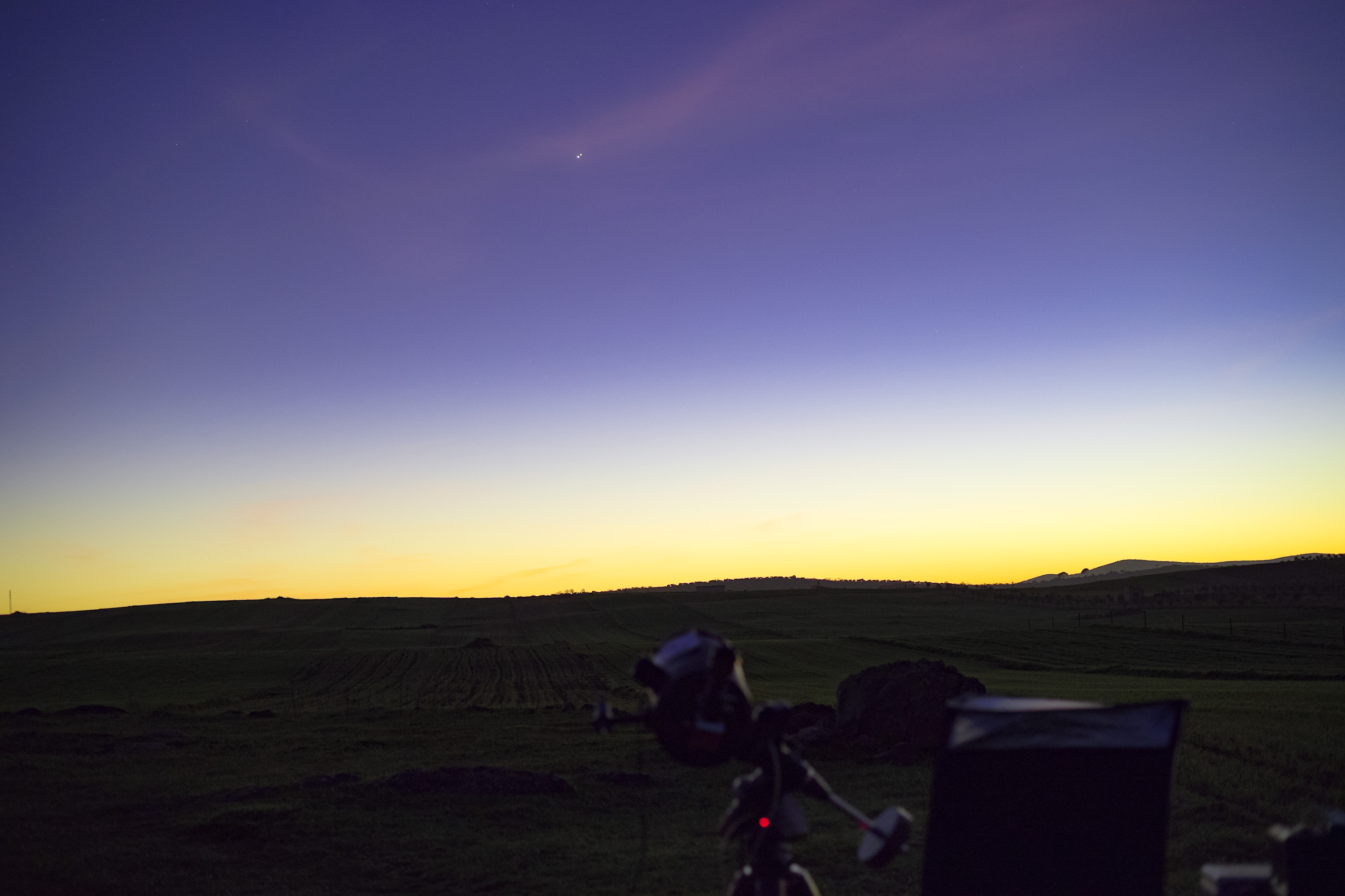 También aprovechamos a sacar alguna foto de gran campo de la conjunción, y como no, una foto de la conjunción con nosotros. Pero todo lo bueno se acaba, a cada minuto que pasaba, los planetas se iban acercando al horizonte y cada ver se veían peor,con mucho cromatismo. Los últimos minutos estuvimos disfrutando de ellos a simple vista hasta que se ocultaron por el horizonte pasadas las 20:20.