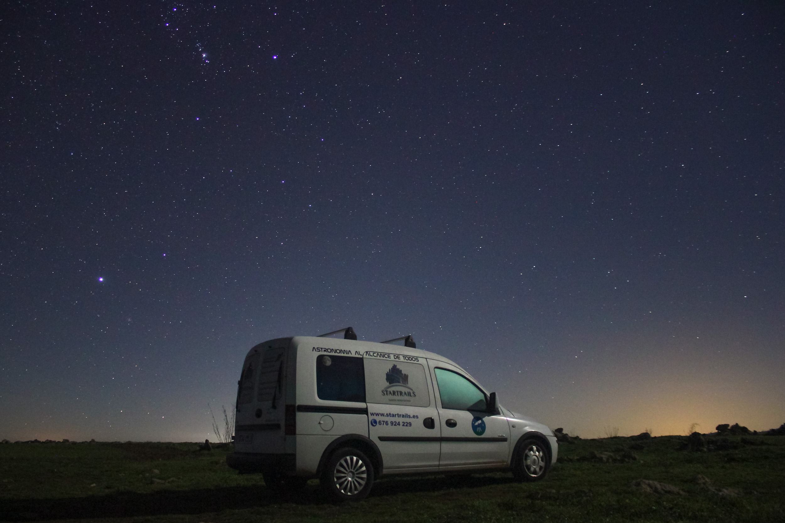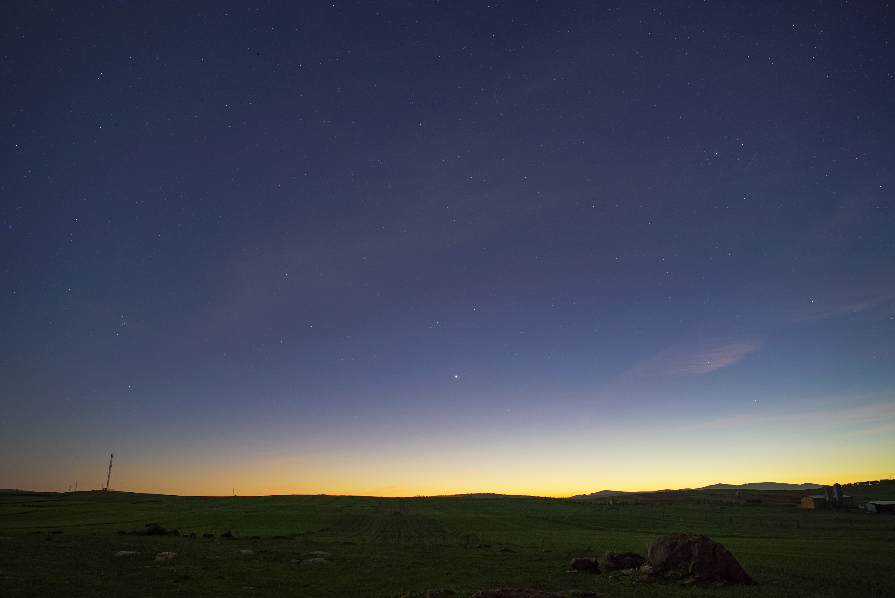Hoy ha tocado viaje largo. Nos hemos desplazado 365 kilómetros en busca de un cielo sin nubes, bajando hasta el pequeño pueblo Villagarcía de la Torre, situado en la provincia de Badajoz, a pocos kilómetros de la frontera con Andalucía. El viaje comenzó a las 13:00 cuando salí de Salamanca donde teníamos un cielo completamente cubierto. Conduciendo llegué a una estación de servicio cerca de Plasencia, allí nos juntamos Juan Carlos y yo, proseguimos nuestro viaje hasta el citado pueblo. Por el camino seguíamos con nubes por todos los lados. Incluso con algo de niebla en algunos puntos. A unos 70 kilómetros de nuestro destino, las nubes comenzaban a retirarse dando paso a un cielo azul precioso. Sobre las 16:50, llegamos al lugar elegido. Nada más llegar, supimos que estábamos en el lugar correcto. Unas vistas libres de obstáculos, sin contaminación lumínica cercana y con el cielo completamente despejado.