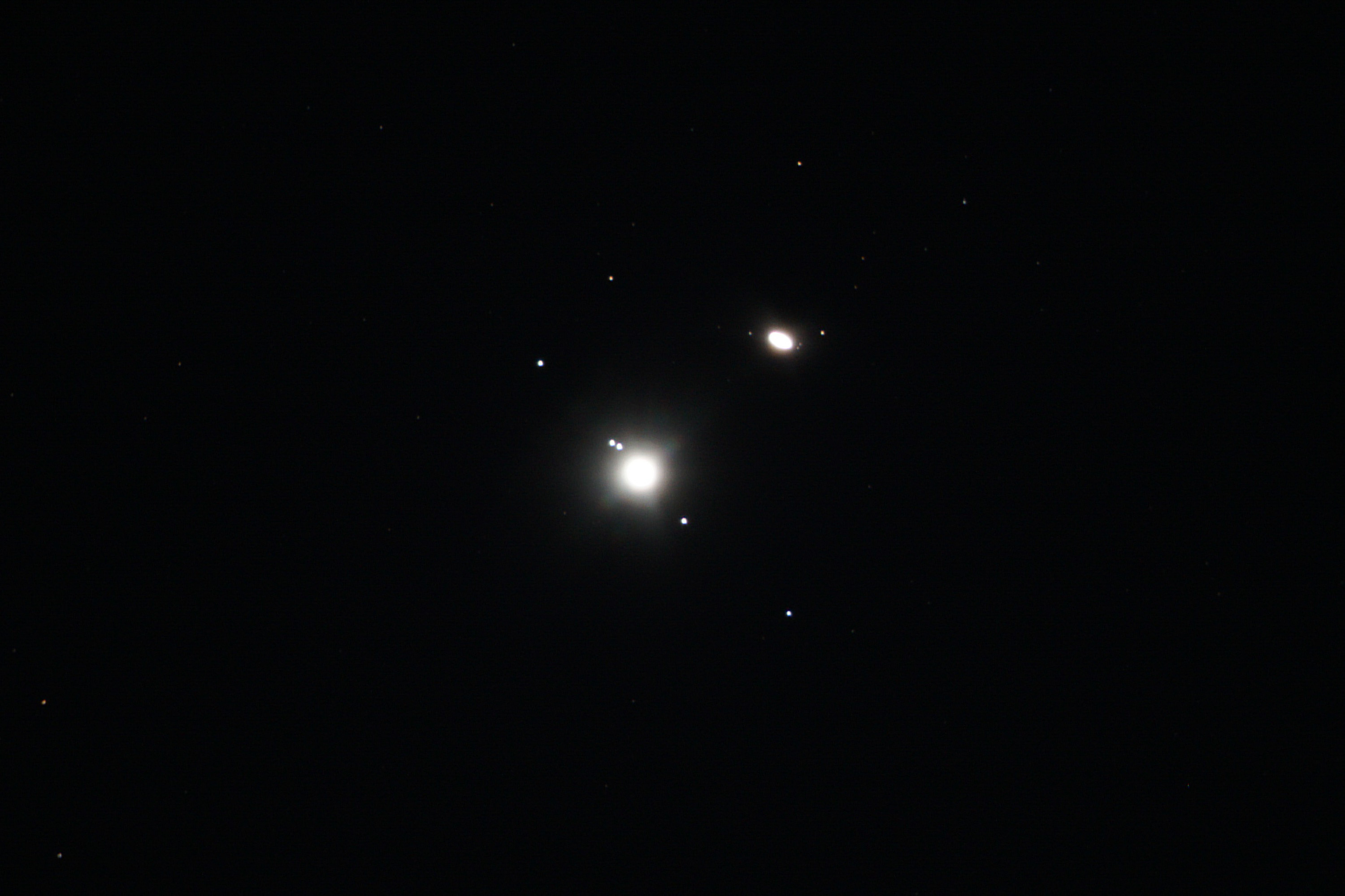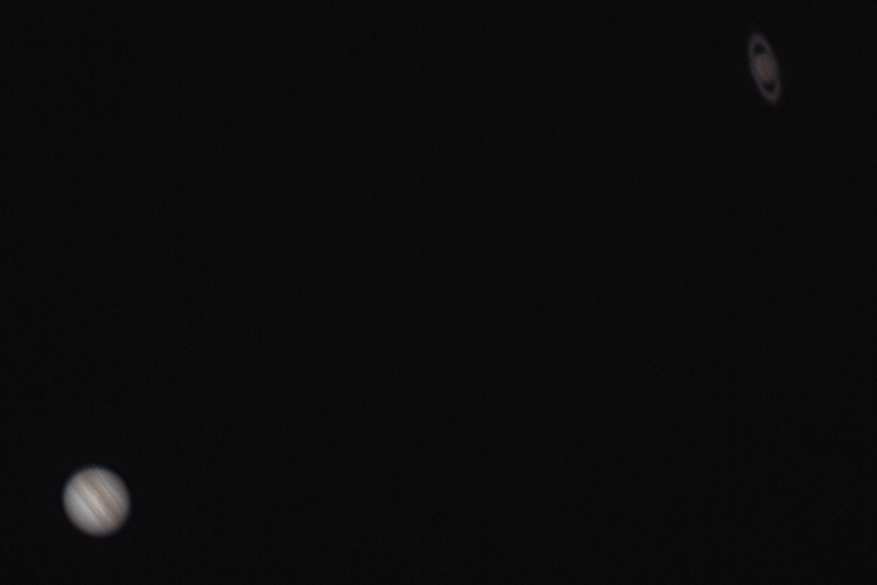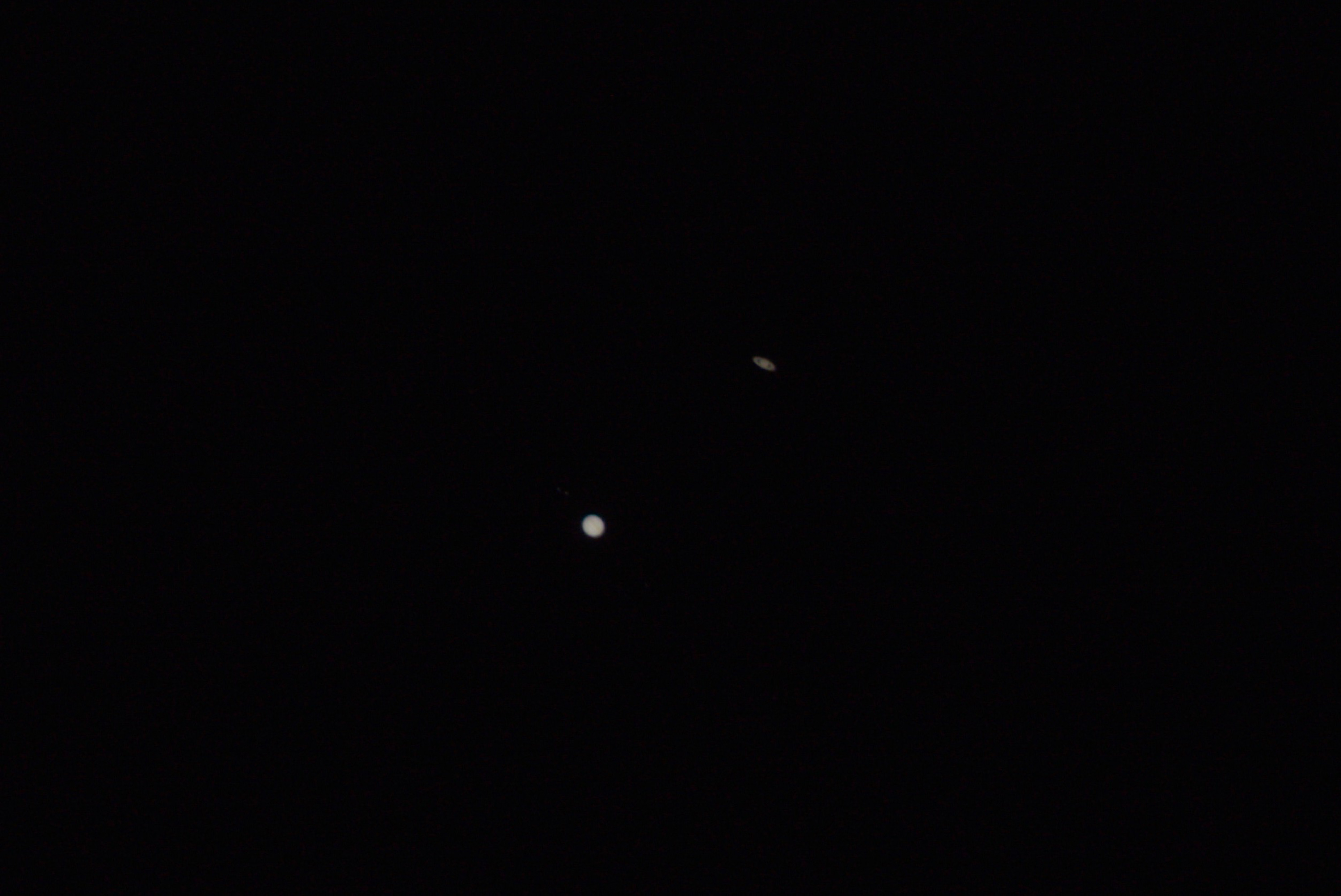Sin la menor duda, los mejor fue la observación visual, tanto a simple vista como con telescopio. A simple vista, se veían los dos planetas extremadamente cerca. Aunque se distinguían separados, daba la impresión de estar muy muy cerca. Más cerca de lo que vemos habitualmente a las estrellas Mizar y Alcor. Además, al estar los planetas en el crepúsculo, el color del atardecer le daba un toque especial. La Luna también estaba alta en el cielo y al mirarla y después mirar a los planetas, es cuanto realmente te dabas cuenta de lo cerca que estaban, ya que sin esa referencia, cuesta imaginárselo. Por telescopio la imagen era brutal! Era impresionante ver a los dos gigantes del sistema solar tan juntos, compartiendo al mimo tiempo el campo dentro del ocular. Además los satélites parecían que eran compartidos, ya que se veían los de los dos planetas e incluso alguna estrella se unió a la fiesta, dando la falsa sensación de haber más satélites. Durante un buen rato estuvimos emocionados hablando de la conjunción,miramos por los dos telescopios, y aunque se empañaron rápidamente por la altísima humedad, pude poner un calentador y gracias a el, los pudimos seguir observando el resto del tiempo sin ningún problema.