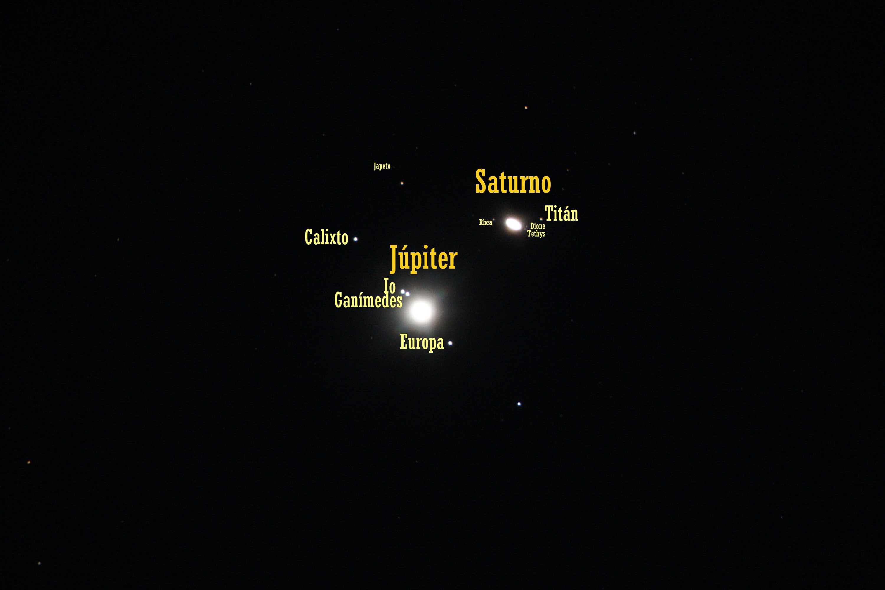 Conjunción de satélites de ambos planetas. Con el nombre de cada uno de ellos. |