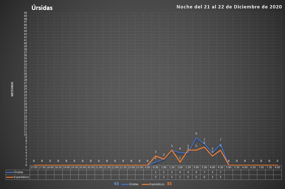 En total contabilicé 54 Úrsidas y casi otros tantos esporádicos. No está mal para esta lluvia de estrellas, pero se quedó muy lejos de los pronósticos.