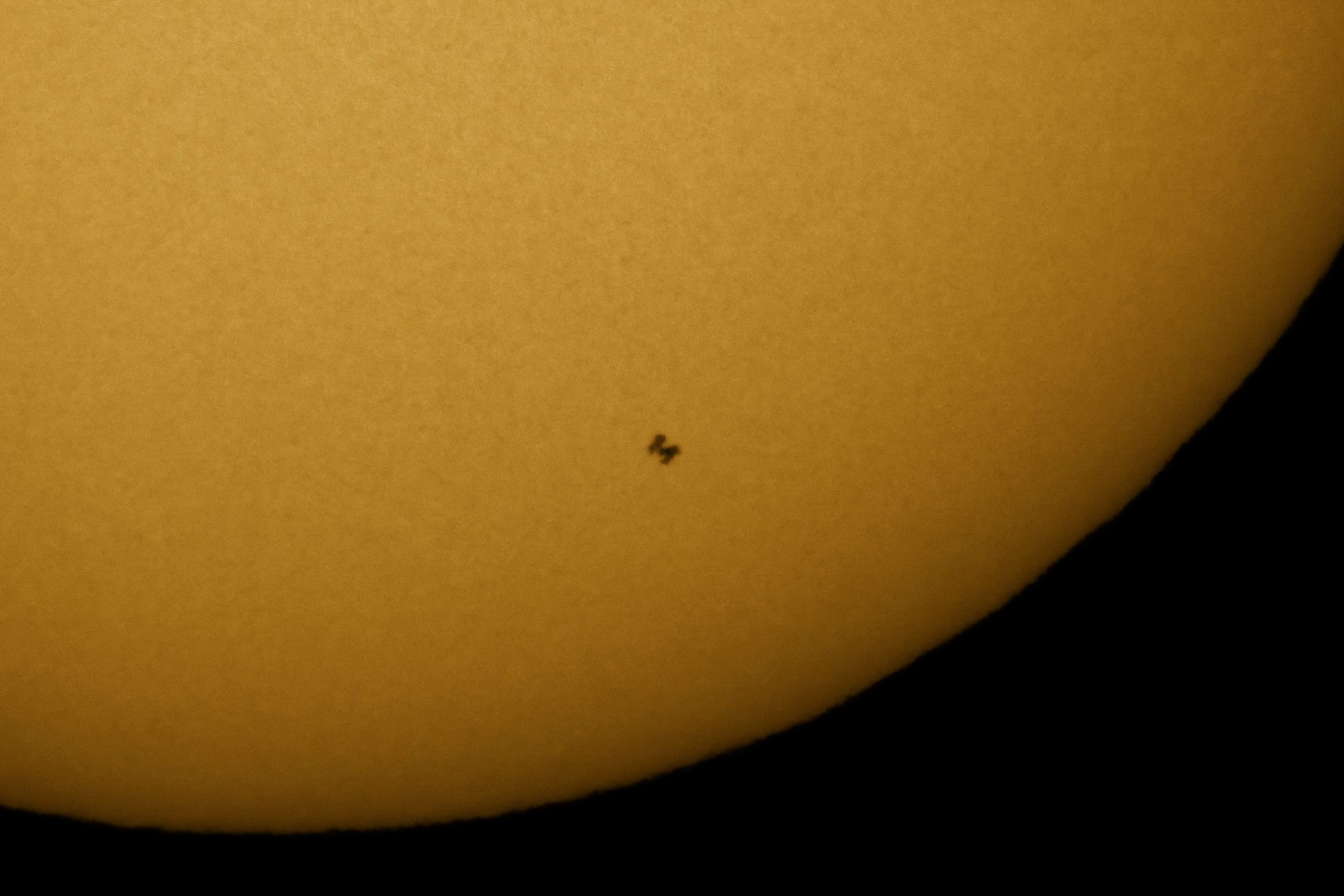 Hacía mucho frío y un viento fuere muy molesto, pero ahí seguíamos pasando frío, porque? porque a las 12:58 estaba previsto que la estación espacial internacional (ISS) pasara por delante del Sol desde nuestra posición. Aunque no pasaría por el centro, si que la veríamos pasar cerca del borde. Bueno... si las nubes nos lo permitían, porque según se acercaba la hora, las nubes iban ganando terreno en el cielo y comenzaron a tapar esporádicamente el disco solar, a falta de 10 minutos para el tránsito. Hasta en 4 ocasiones las nubes taparon el Sol por completo. Las nubes pasaban rápidamente y el Sol volvía a verse al minuto siguiente. Lo malo es que cada vez había mas nubes en el cielo, y estas eran nubes bajas que se movían muy rápido, por efecto del viento, así que iba a ser cuestión de suerte que viéramos el tránsito de la ISS. A falta de 1 minuto, comenzaba un claro entre las nubes y tuvimos la esperanza de ver el tránsito y así fue. Justo ala hora prevista, las 12:58:54, la estación espacial internacional hizo su aparición y pasó a toda velocidad por delante del Sol. Pudimos verlo por los monitores de los ordenadores. Y menos de un minuto después, se volvió a nublar, por lo que , efectivamente, tuvimos mucha suerte. Eso si, la estación espacial se veía muy pequeña, algo que ya sabíamos porque el Sol estaba a poca altura. La ISS tenía un tamaño aparente de poco mas de 31" y tardó 0.92 segundos en pasar.