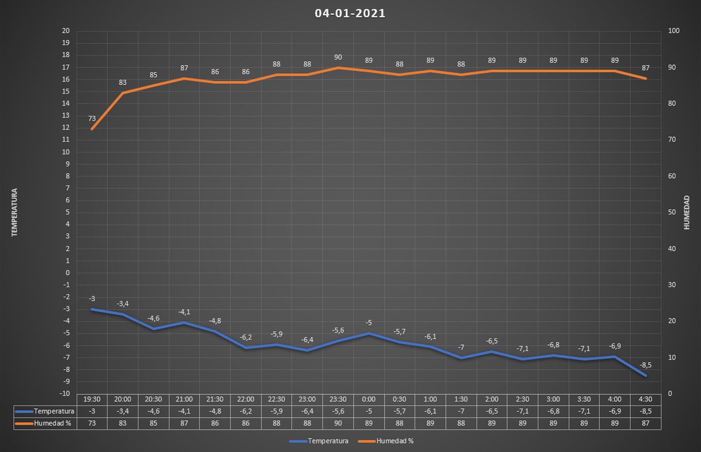 Condiciones climatológicas: Cielo prácticamente despejado, salvo media hora sobre las 00h que hubo una nube ocupando un 10% en la parte sur. Alcanzamos una temperatura mínima de -8.5 a última hora, según recogía.