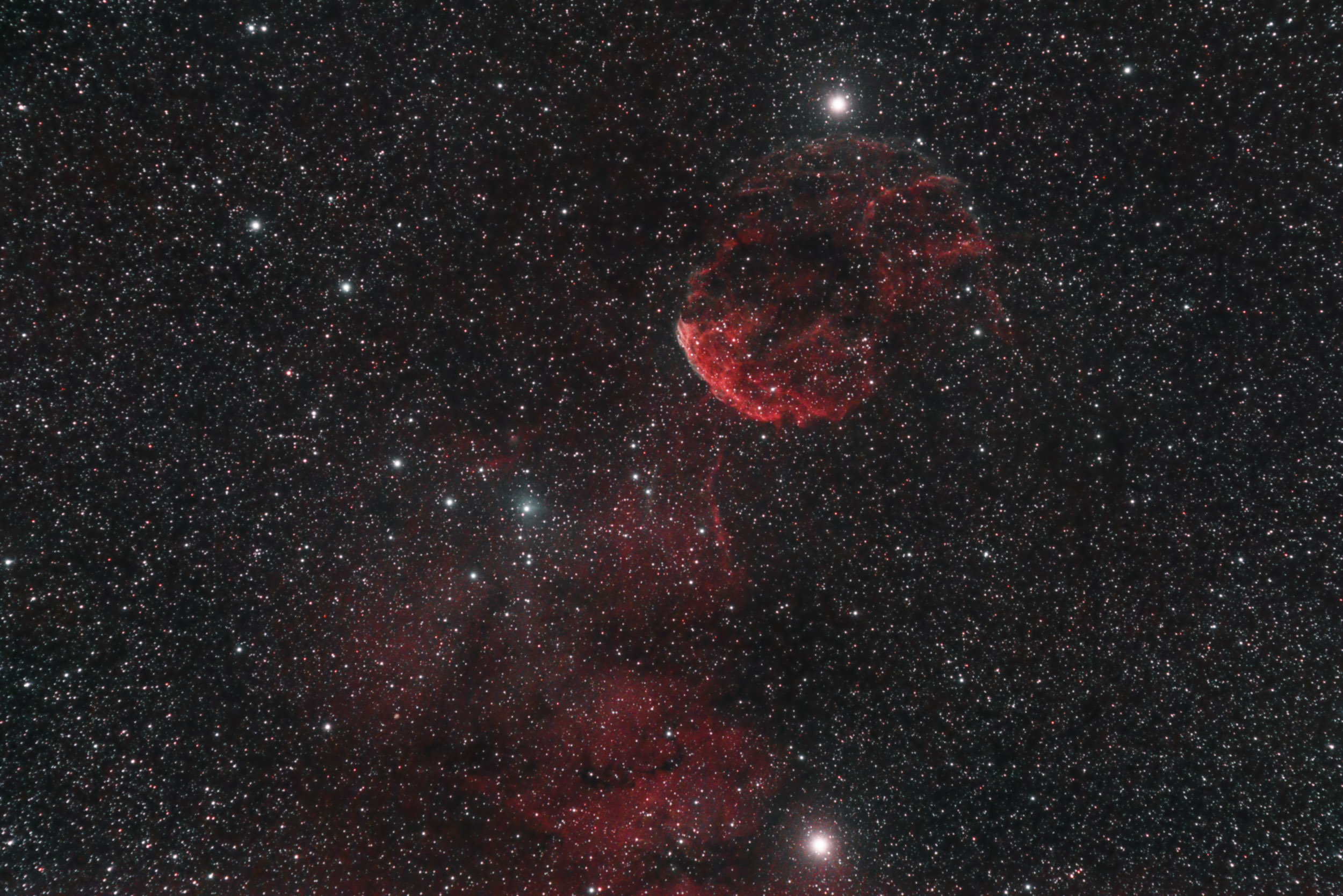 Llegué pasadas las 18:40 al lugar de observación. Ya se había ocultado el sol por lo que apuré a montar el equipo rápidamente, incluso me hizo falta usar la linterna para terminar de montar. Lo primero que hice fue apuntar a la nebulosa IC443 y dejé el equipo sacando fotos mientras me ponía a observar con el Dobson para probar el filtro de hidrógeno Beta.