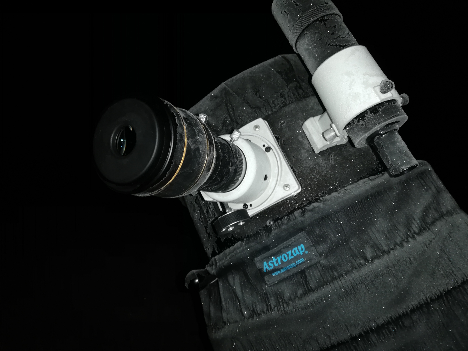 Estuve echando un vistazo y aunque no era la mejor noche pude ver la efectividad del filtro, de todas formas tendré que salir más noches para ver qué tal se porta realmente. Entre los objetos que observé está la nebulosa de Norteamérica o NGC7000 , la nebulosa California y la Nebulosa Cabeza de Caballo. Esta última me costó mucho verla porque además se empañaba el telescopio rápidamente y solo tenía unos pocos segundos desde que acercaba el ojo hasta que se empañaba para poder mirar. Este fue uno de los grandes inconvenientes de la noche ya que había muy poca temperatura y las lentes y espejos se cubrían de hielo impidiendo mirar por los oculares. Lo peor de todo fue que al mirar por los oculares el propio calor de la cara hacía que se empañara rápidamente por lo que desaproveché casi toda la noche de observación y dejé el telescopio apartado acumulando hielo que luego me tocó retirar a la hora de recoger. Aun así, a primera hora, si que me dio tiempo a observar algunos objetos de cielo profundo como M42, M43, M31...