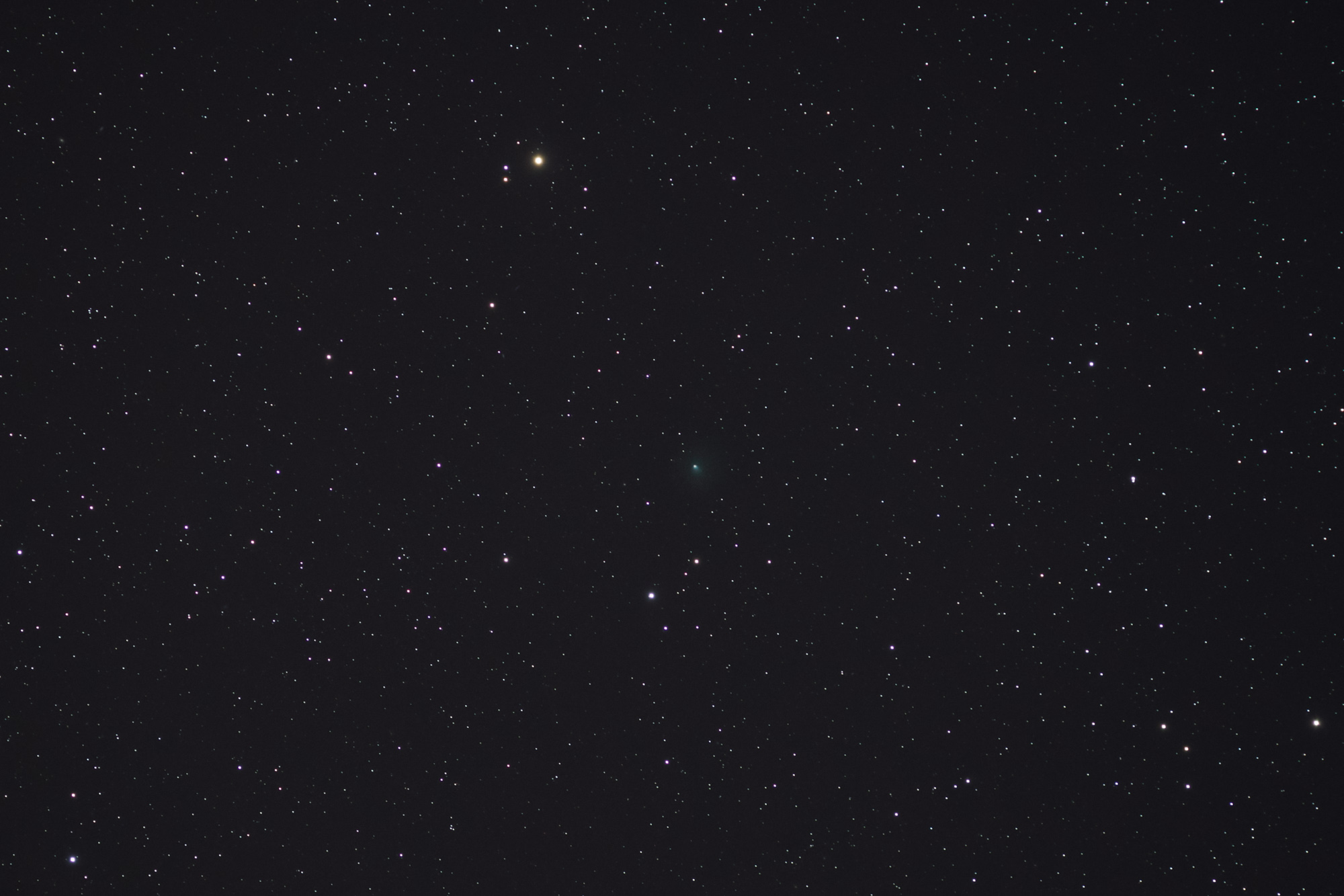 Hoy la tarde está bastante mejor no hace nada de viento y no hay ni una sola nube. Después de montar todo tranquilamente,me sobraba tiempo para dar una vuelta por la zona y merendar. Cuando oscureció lo suficiente me puse a alinear y después saqué unas fotos algunos cometas. El primero fue el C/2020 R4 (ATLAS) que se encontraba muy bajo en el horizonte oeste. Y aunque pensé que no lo había fotografiado, una vez llegué a casa y apilé las fotos, si que pude localizarlo, justo en el borde del campo de la cámara. Se ve muy débil y sin núcleo definido, pero me conformo con haberlo fotografiado .Después seguí con el C/2020 M3 (ATLAS) que se encontraba muy cerca de la estrella Capella y hace tiempo que no lo fotografío. Aunque ha bajado de brillo, aun sale moderadamente bien en las fotos. Por último fui al cometa 156P/Russell-LINEAR. Este se veía pequeño, pero definitivamente el mejor de los tres, con una zona central definida y una pequeña cola dentro de la coma.