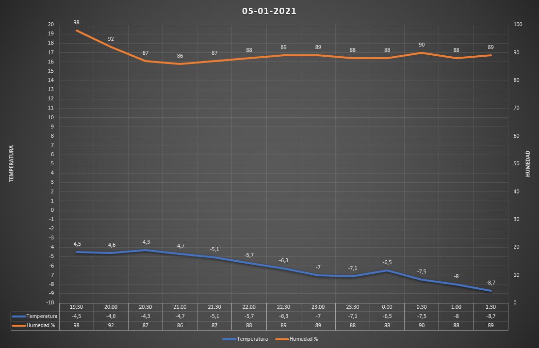 Condiciones climatológicas: Cielo despejado. Temperatura mínima de -9.08ºC a la 01:05